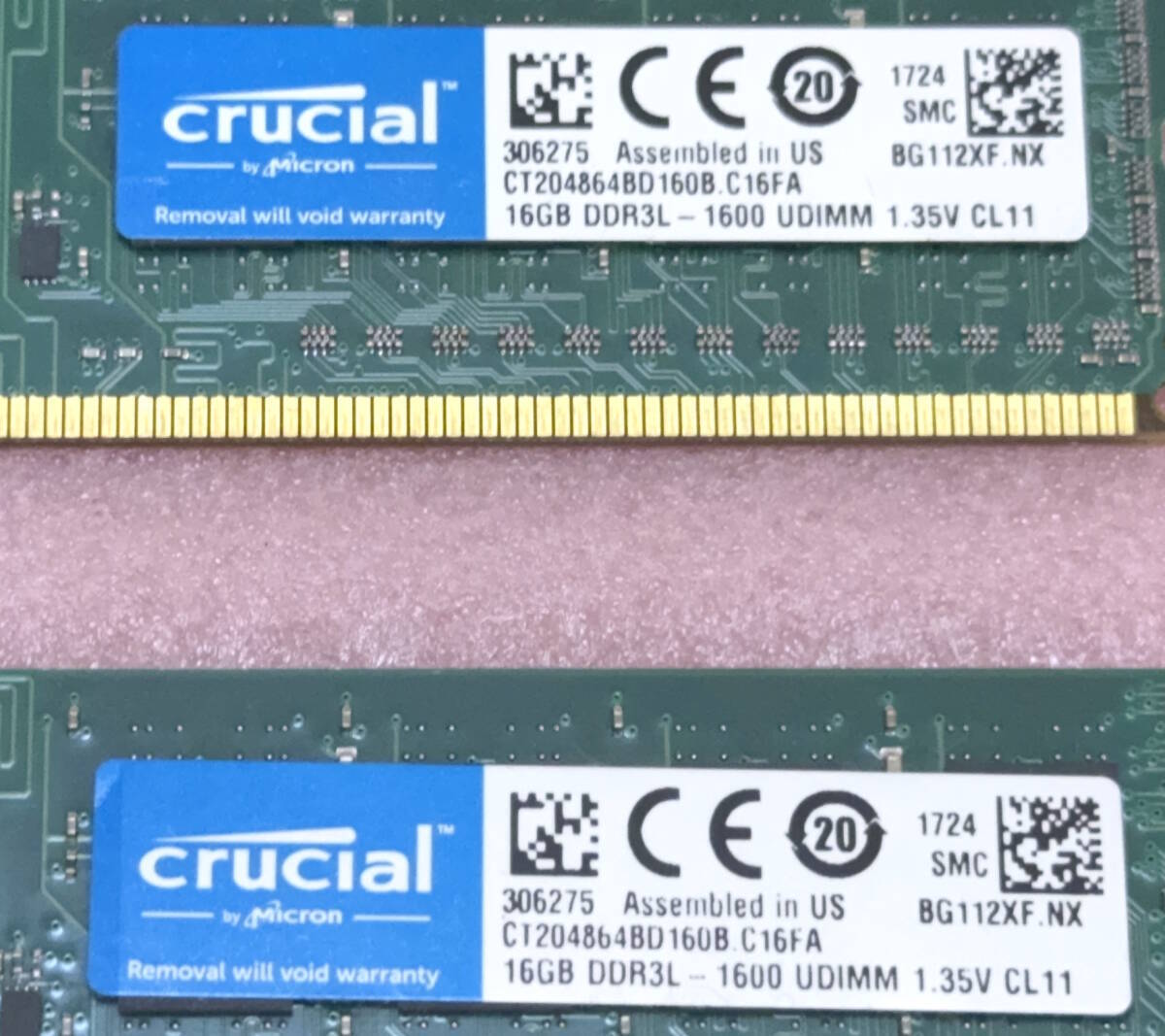◆Crucial CT204864BD160B 2枚セット *PC3L-12800U/DDR3L-1600 Micronチップ 240Pin DDR3 UDIMM 32GB(16GB x2) 動作品 收藏