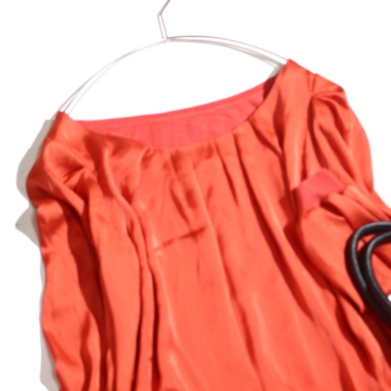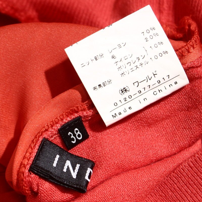 美品 インディヴィ INDIVI 株) ワールド 合物 ニット 切替 艶 とろみ シフォン ニットカットソー 9号 38 オレンジ レッド 赤 收藏