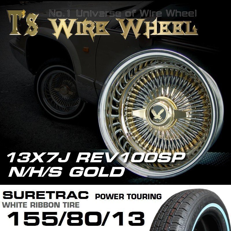 〇 ティスファクトリー Ts ワイヤーホイール 13×7J REV リバース トリプル ゴールド 100SP シュアトラック ホワイトリボンタイヤ セット 收藏