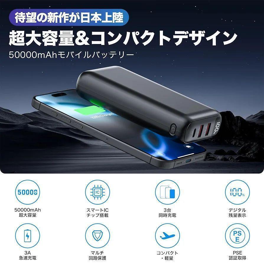モバイルバッテリー 大容量 50000mAh 22.5W/PD20W 3A急速充電対応 iPhone16充電器 Type-C入出力 收藏