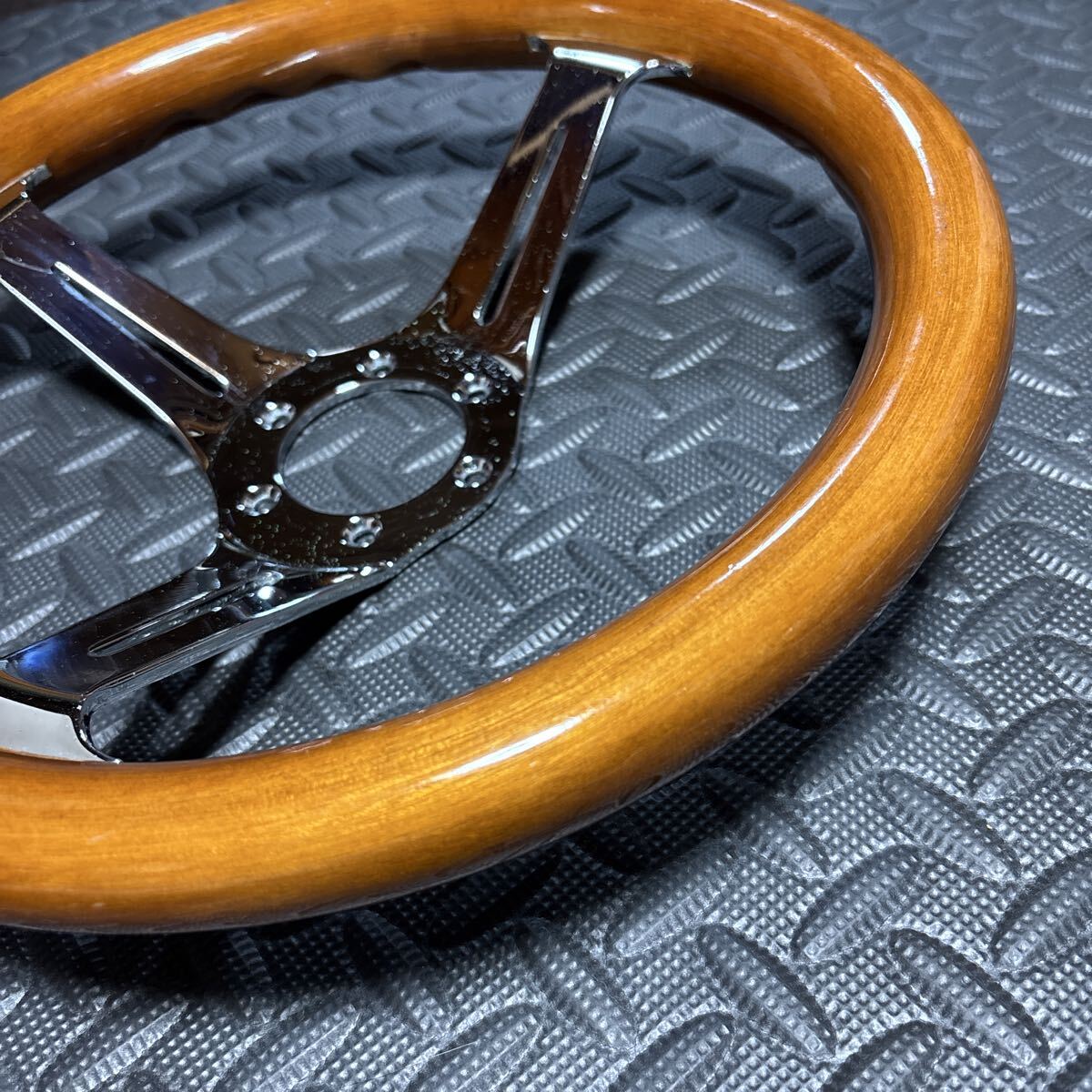 当時物 ウッド ステアリング ディープコーン メッキ 3本 スポーク 小径 ハンドル 約33cm 木目 MADE IN JAPAN 日本製 ( モモ 穴ピッチ レア 收藏