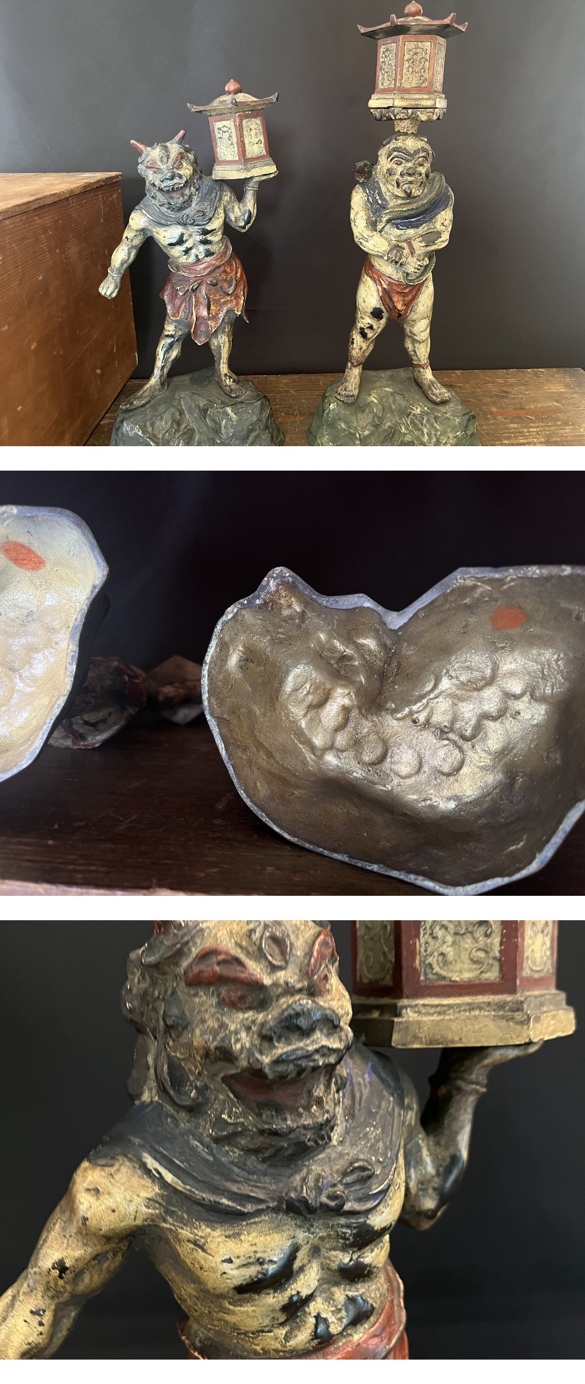 | 商品説明 | 唐金像 「天燈鬼・龍燈鬼」 西金堂須弥壇安置国宝模写 重量:約6.0kg (3.2kg、2.8kg) 高さ40cm、34cm程 鎌倉再興期誕生仏教像 合箱付き。 唐金製の真面目な作品です。お探しの方いましたらご覧ください。 |