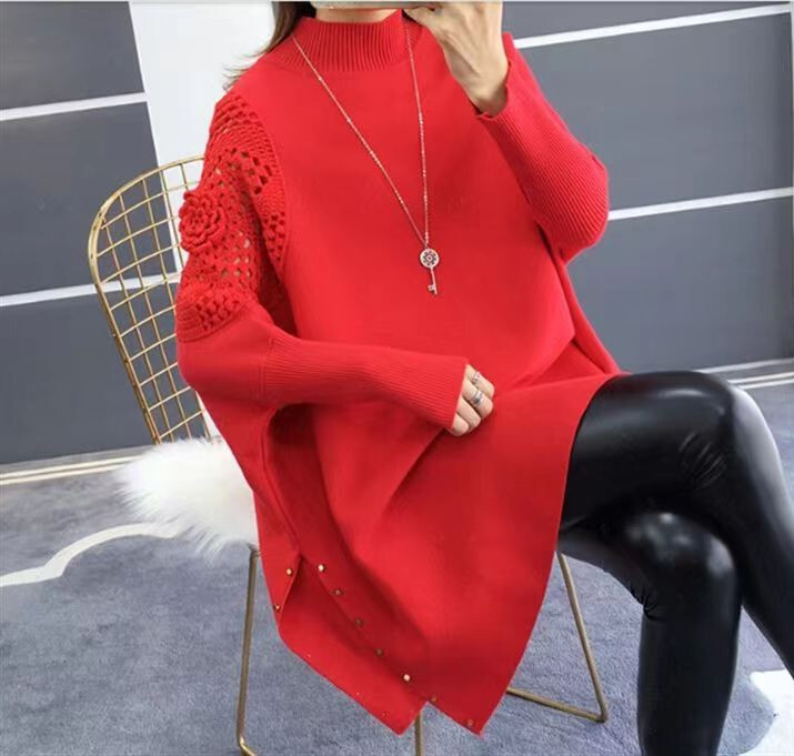 ニット セーター 長袖 秋冬 チュニック レディース トップス 大きいサイズ 袖コンシャス レース パフスリーブ レッド 收藏