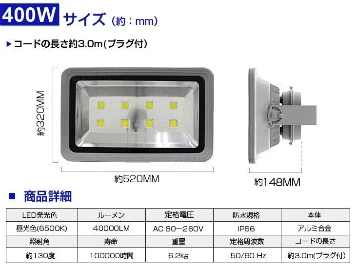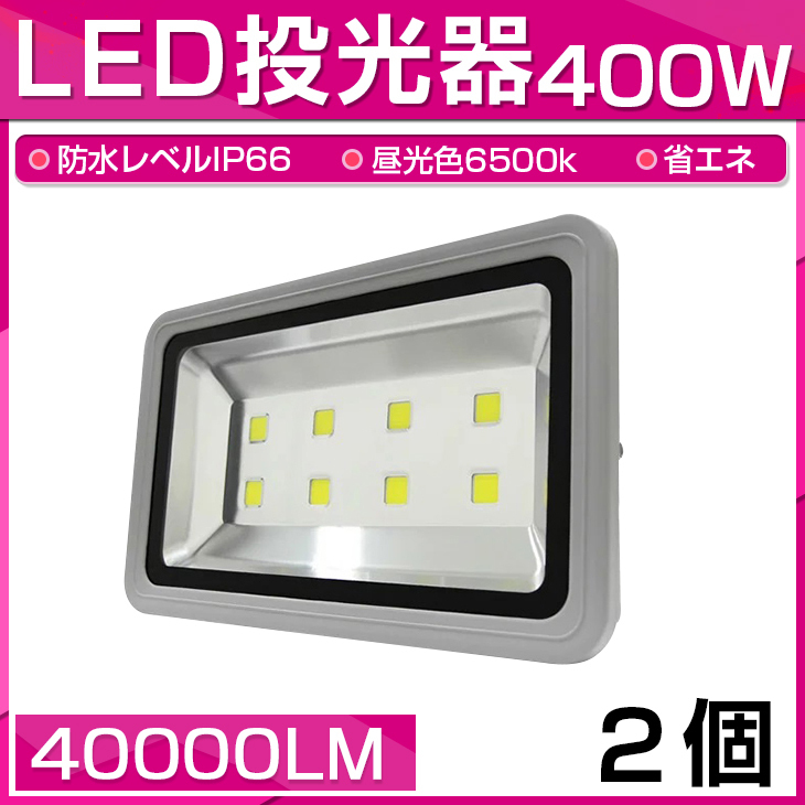 【即納】2個セット LED 投光器 400W 4000W相当 40000LM 昼光色 6500K 広角130度 防水加工 看板 作業灯 屋外灯 3mコード付き 送料無料 收藏