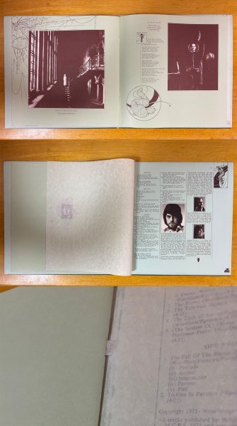 ジャケット / 盤 → VG++/ EX ※1979/9/24 京都にて中古購入。ジャケは底に皺や剥げが少しと裏面に引っ掻きキズ1本確認されますが、大きな損傷はなく良好と言えます。盤は使用頻度は少なかったと思われ、ストレス無く試聴できる物です。超音波洗浄も行い、さらに状態は良くなっています。 なお、Wジャケの内側に綴じ込んであるブックレットは問題のない状態ですが、保護シートが経年による変色とホッチキス留め(3箇所)の部分がハズレかけ(破れ)が確認されます。また、付属のカンパニー・スリーヴには横1箇所(10cm)と底(5cm)に抜けがございます。 |