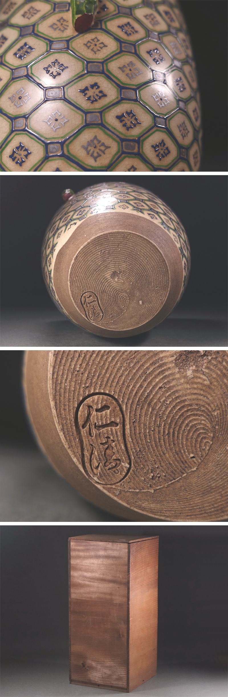 ∇花∇徳川家御所用品【野々村仁清】作 葵御紋入色絵花菱亀甲地紋皆具 水指・建水・杓立・蓋置 各仁清陶印 收藏