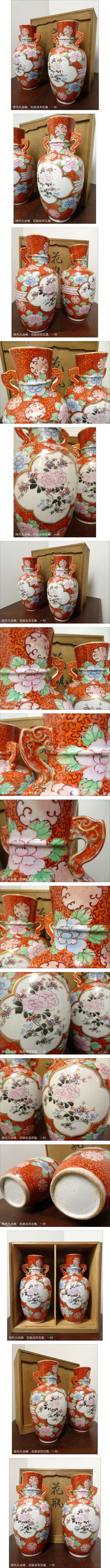 初だし 時代 九谷焼 花紋 双耳 花瓶 花入 一対 高さ29.8cm 木箱付 | |||||||||||