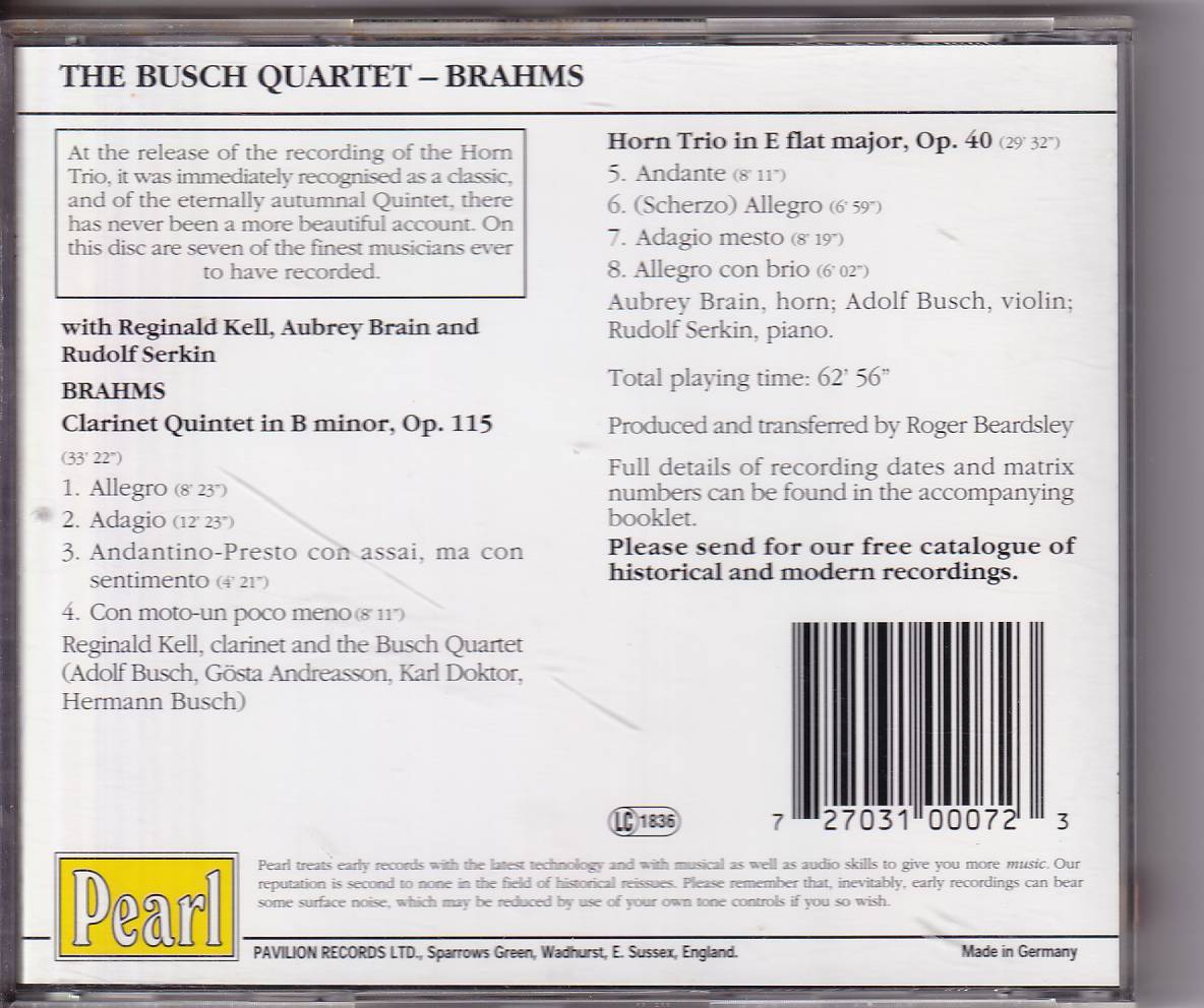 R・ゼルキン&ブッシュ四重奏団 ブラームス:クラリネット五重奏曲 独PEARL 盤面に再生に影響ない擦り傷あり