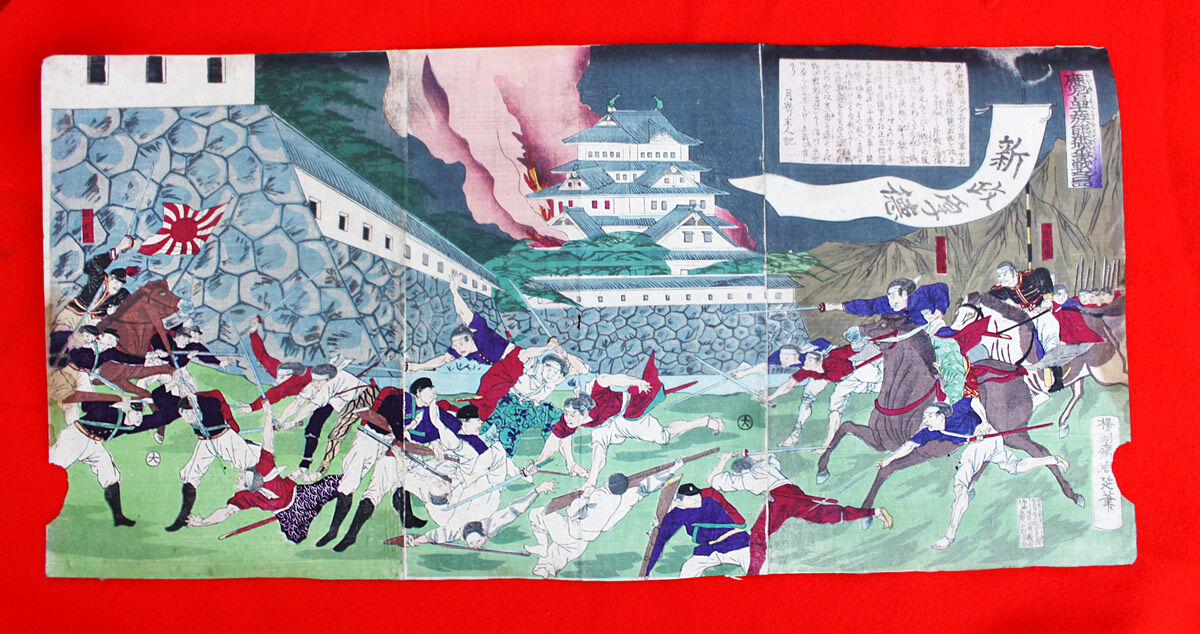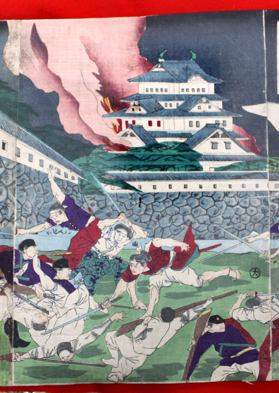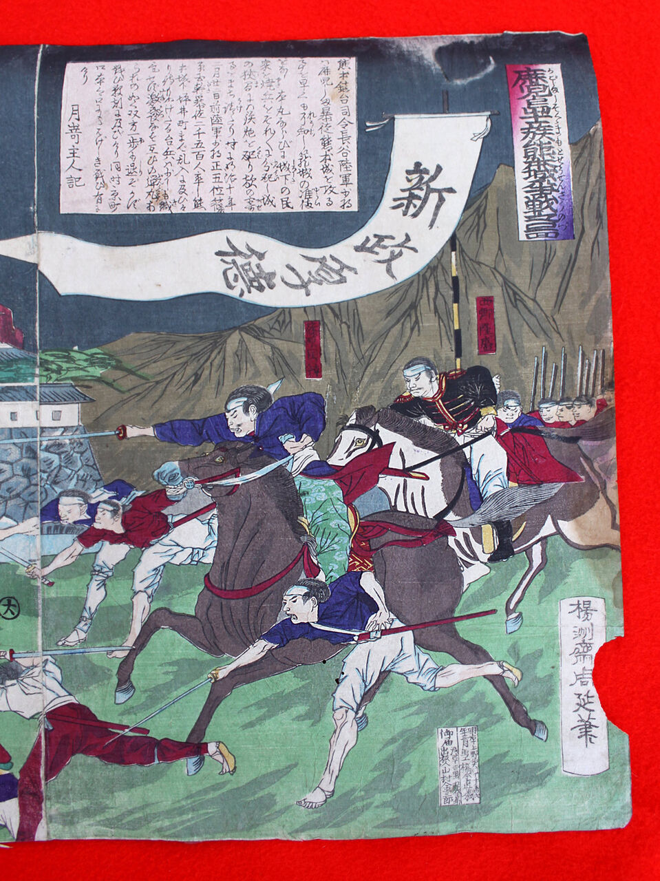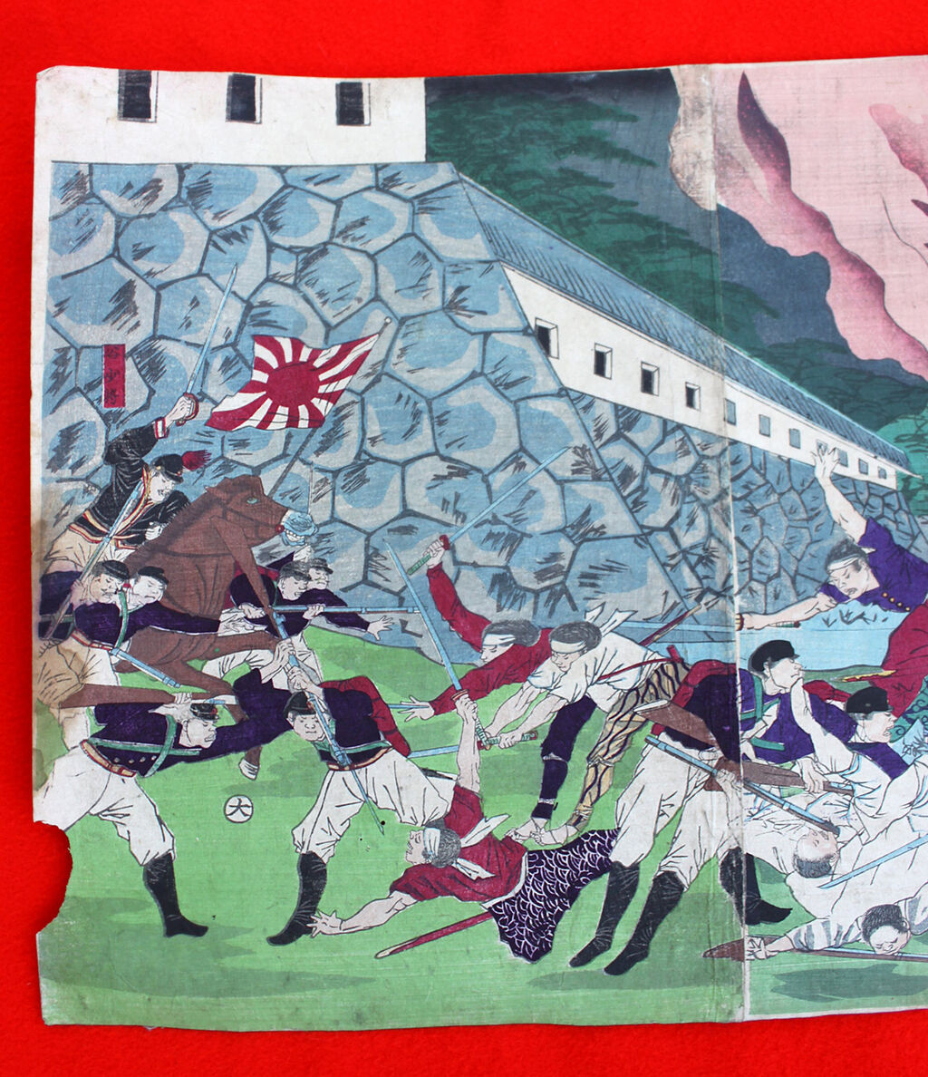 揚州斎周延筆 鹿児島士族熊本城戦争の図 72㎝×36cm 3枚もの 両端に掛け破れがあり 裏打ちあり