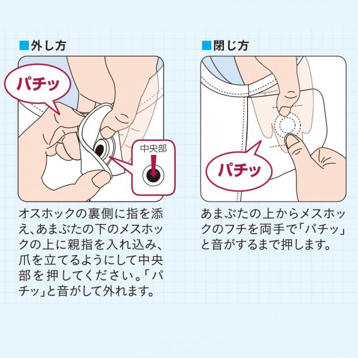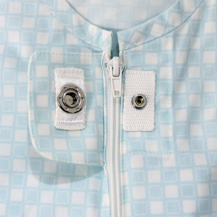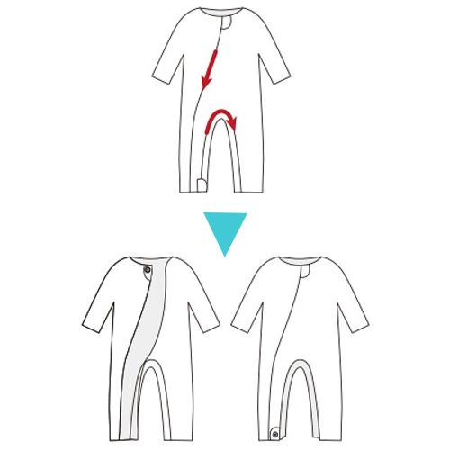 | さまざまな症状の方に対応した介護ねまきです。アイデアホックが布で覆われていて表から見えない設計。首元から右足首にかけて開き、股部分も開閉可能です。 |