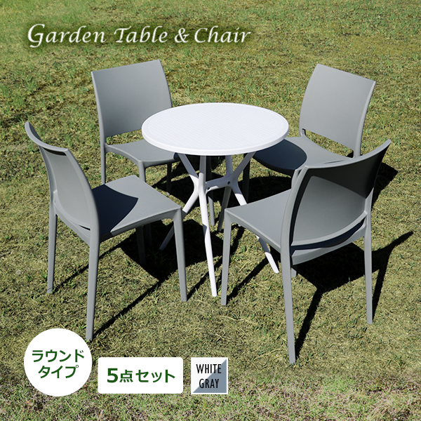 送料無料 プラスチックチェア ガーデンチェア ガーデンテーブル 5点セット UVカット ホワイト×グレー ラウンドテーブル 丸型 4脚 軽量 收藏