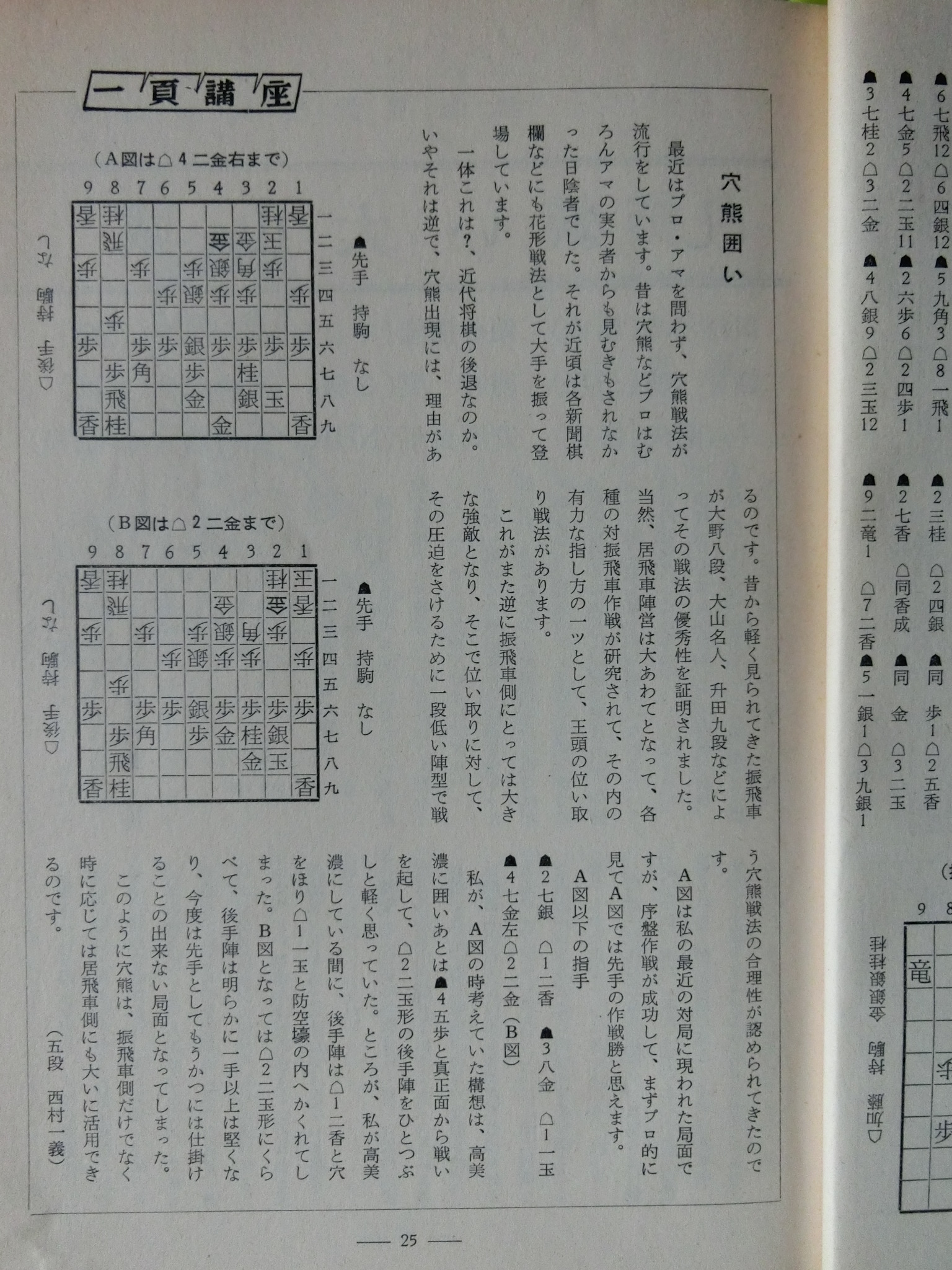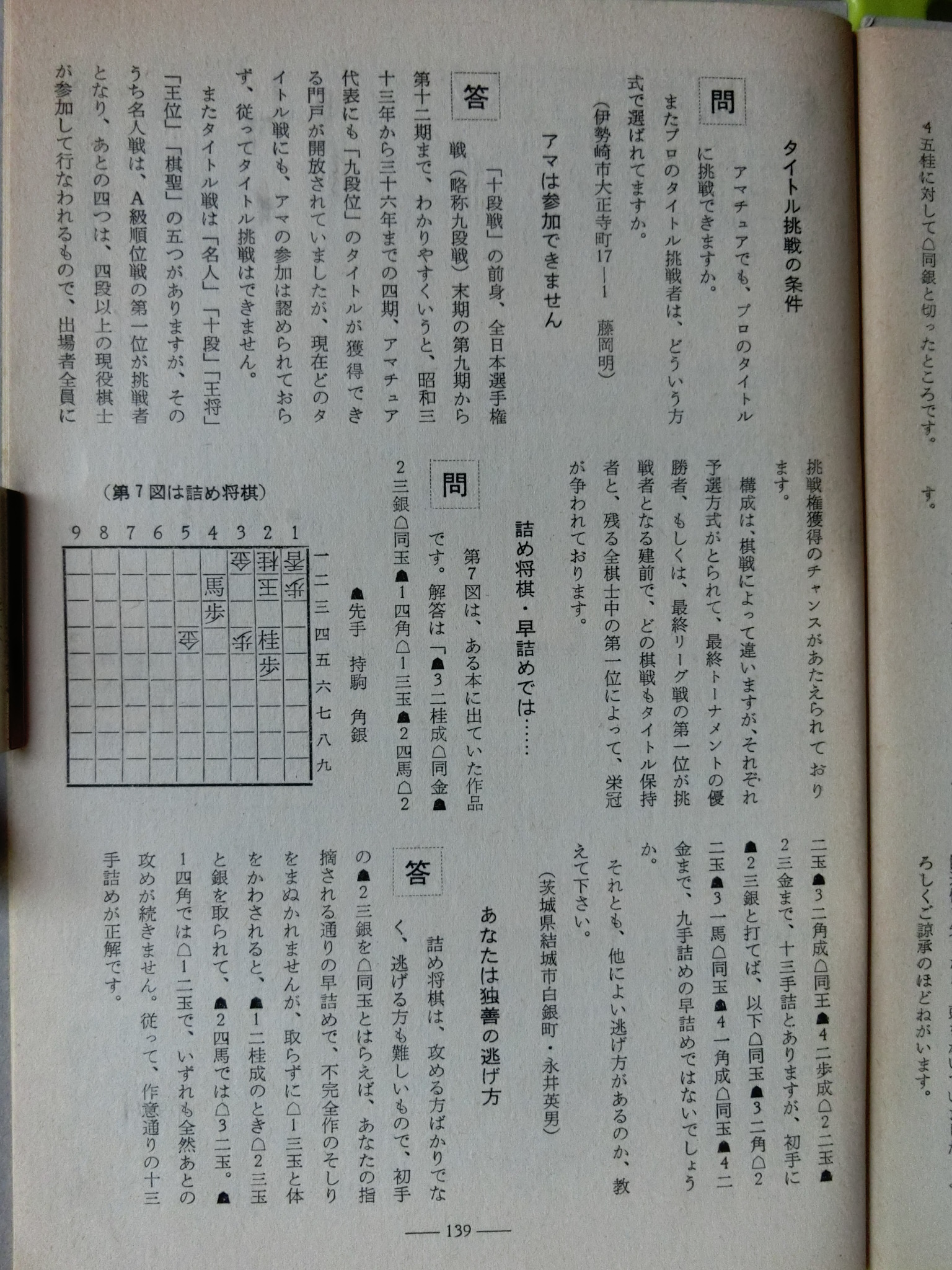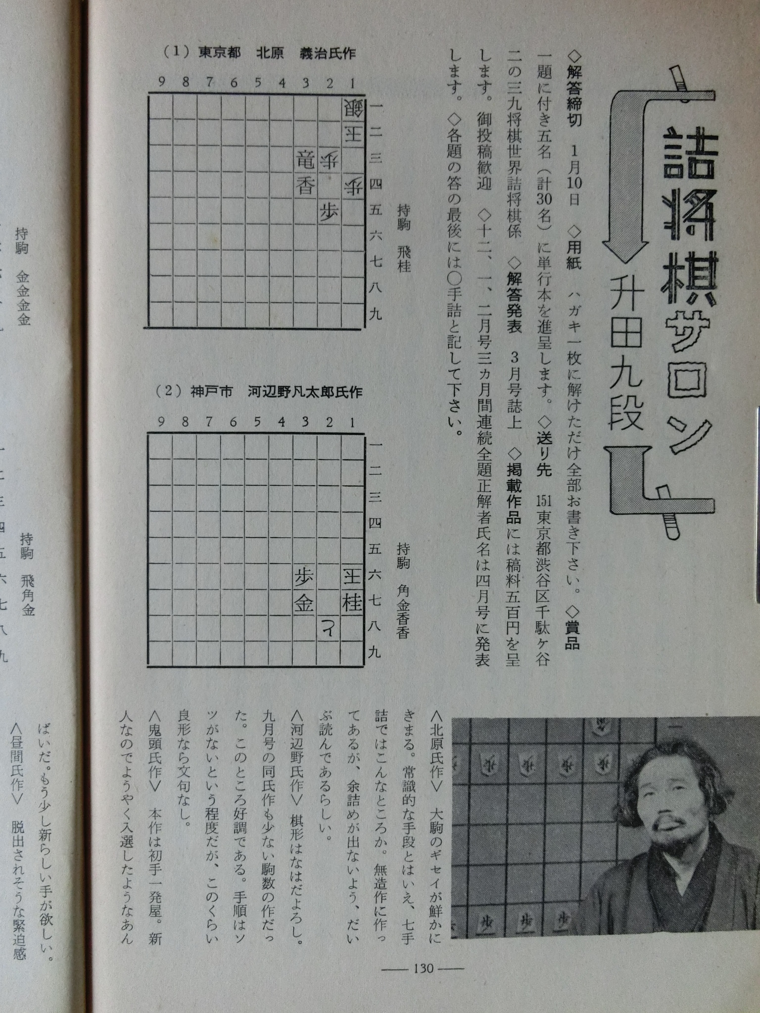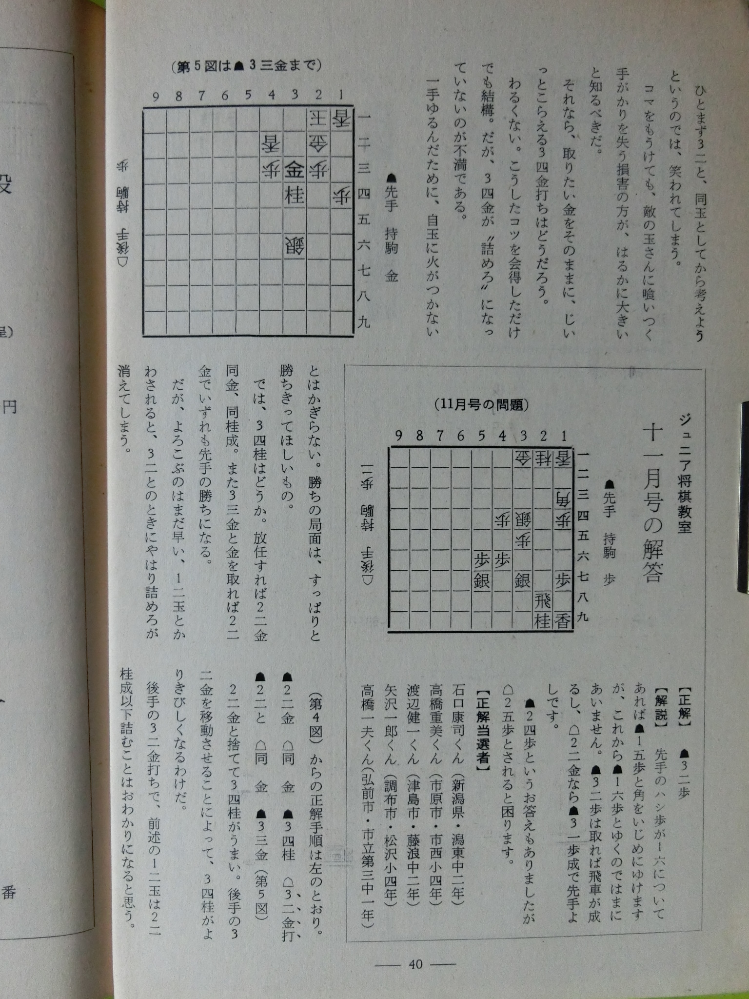 将棋世界 1969_昭和44年 1月 1日 1月号 大山康晴45才,鍋島古舟,高本功,吉田信義,梶塚昌弘,福井東呉之輔,石成富栄,近藤道義,田中義重,富沢幹雄,永沢勝雄,坂口允彦,西村一義,五十嵐豊一,内藤國雄,長谷部久雄,木村義徳,米長邦雄,加藤一二三,富沢幹雄,太期喬也 発行日 1969_昭和44年 1月 1日 発行 日本将棋連盟 大きさ A5 特別付録 無し 表紙・ニワトリ 鍋島古舟 才 カット 高本功 14ページ 三菱カラーテレビ 高雄 電子忍法 三菱電機 裏表紙 東芝電子連動 テレビ 王座 東芝 将棋棋士一覧から 棋士一覧DBから 名人 大山康晴 46才 1923年 3月13日 - 1992年 7月26日 グラビア 表彰感謝の日 橋爪新 7段 7氏昇段 グラビア 表彰感謝の日 将棋会館玄関 グラビア 第7期十段位決定戦 大山 2勝 加藤一二三 1勝 グラビア 将棋担当記者座談会 梶川(サンケイ)、勝村(日経) 岡(NHK)、落合(共同) グラビア 将棋担当記者座談会 田村(朝日)、頼尊(中日) 能智(新聞三社連合) 山村(読売) グラビア 今年のホープ 米長邦雄 6段 26才 1943年 6月10日 - 2012年12月18日 グラビア 大駒落指導対局 長谷部久雄 7段 大内延介 6段 グラビア 将棋連盟事務 箱根に遊ぶ ホテル花月園 グラビア 吉田女流名人、村山準名人 VS 初段コース卒業者 お好み対局 グラビア 最強者戦決勝 優勝 山田道美 8段 36才 1933年12月11日 - 1970年 6月18日 15ページ 新年のごあいさつ 日本将棋連盟会長 坂口允彦 8段 61才 1908年12月10日 - 1990年 1月18日 第7期十段戦 第2局 16ページ どたん場で逆転 自戦記 大山康晴 十段 46才 1923年 3月13日 - 1992年 7月26日 25ページ 一頁講座 穴熊囲い 西村一義 5段 28才 1941年12月14日 54ページ 一頁講座 迷い 西村一義 5段 28才 1941年12月14日 26ページ 将棋担当記者座談会 微動だにしない大山城 中原に期待 31ページ 古棋書復刻について 創刊35周年記念 詳細は次号で 基礎教室 36ページ 超初心講座 1 魔女と神童をつくる 五十嵐豊一 8段 45才 1924年 9月27日 - 2008年 8月30日 40ページ あたまの体操をどうぞ 11月号の解答 42ページ 香車の世界 1 1本気 内藤國雄 8段 30才 1939年11月15日 大駒落指導対局 46ページ 6枚落 力不足に泣く 吉田信義 8級 長谷部久雄 7段 36才 1933年 7月17日 - 2017年12月27日 48ページ 4枚落 下手、1手も誤まらず 梶塚昌弘 初段 大内延介 6段 28才 1941年10月 2日 - 2017年 6月23日 50ページ 2枚落 接戦中の下手の名手 福井東呉之輔 初段 長谷部久雄 7段 36才 1933年 7月17日 - 2017年12月27日 52ページ 2枚落 勝機を逸した金打ち 石成富栄 2段 大内延介 6段 28才 1941年10月 2日 - 2017年 6月23日 56ページ 一年で全読者に初段を 授与 69回 3問 木村義徳 6段 34才 1935年 5月 2日 60ページ 一年で全読者に初段を 授与 67回 解答 宮坂幸雄 7段 40才 1929年11月30日 66ページ 初段コース入段者 氏名 66ページ 初段コース入段者 氏名 58ページ 昇段コース試験問題 49回 3問 芹沢博文 8段 33才 1936年10月23日 - 1987年12月 9日 63ページ 昇段コース試験問題 47回 解答 松田茂行 8段 48才 1921年 6月28日 - 1988年 8月 2日 松田茂役 68ページ A級の名門 勝負師の記録 塚田正夫 9段 天狗太郎(山本亨介)46才 1922年 8月14日 - 1977年 8月28日 74ページ 米長邦雄6段の巻 順位戦好局集 米長邦雄 6段 26才 1943年 6月10日 - 2012年12月18日 吉田女流名人、村山準名人 VS 初段コース卒業者 87ページ 女流名人の貫禄示す 吉田紀代子 3段 近藤道義 初段 高柳敏夫 8段 49才 1920年 2月20日 - 1986年 9月27日 92ページ どの手が正解か? どの手が正解か? 村山幸子 2段 田中義重 初段 94ページ 解答 どの手が正解か? 村山幸子 2段 田中義重 初段 96ページ 棋士住所録 103ページ 春の箱根へ 1泊ご招待 第23期順位戦星取表 104ページ A級 成績表 11名 105ページ B級1組 成績表 14名 106ページ B級2組 成績表 20名 107ページ C級1組 成績表 14名 108ページ C級2組 成績表 16名 43年度前期 110ページ 関東奨励会A組 成績表 11名 110ページ 関西奨励会A組 成績表 10名 111ページ 関東奨励会B組 成績表 25名 111ページ 関西奨励会B組 成績表 16名 112ページ 花村、前回の優勝者を破る NHK杯争奪戦・第4局 六文銭謙 第18回 116ページ 学生将棋 関東大学秋季リーグ 早稲田、日大を破る 116ページ 学生将棋 関西大学秋季リーグ A級、京大が連続優勝 119ページ 新春クロスワード クイズ 120ページ 飛車落定跡をたずねて 古典定跡研究 富沢幹雄 7段 49才 1920年 4月20日 - 1998年 1月10日 126ページ ずいひつ お化けの先生 永沢勝雄 6段 65才 1904年 4月13日 - 1985年 2月22日 127ページ ずいひつ 大正12年のころ 建部和歌夫 8段 60才 1909年 7月25日 - 1974年 9月 4日 128ページ ずいひつ 大正12年のころ 建部和歌夫 8段 60才 1909年 7月25日 - 1974年 9月 4日 129ページ ずいひつ 因果な手 太期喬也 才 130ページ 詰将棋サロン 2題 選 升田幸三 9段 50才 1918年 3月21日 - 1991年 4月 5日 131ページ 詰将棋サロン 4題 選 升田幸三 9段 50才 1918年 3月21日 - 1991年 4月 5日 132ページ 詰将棋サロン 11月号の解答 編集太郎 133ページ 詰将棋サロン 11月号の解答 編集太郎 134ページ 詰将棋サロン 11月号の解答 編集太郎 134ページ 9,10、11月号連続全題正解者 全題正解者 編集太郎 134ページ 9,10、11月号連続全題正解者 全題正解者 編集太郎 将