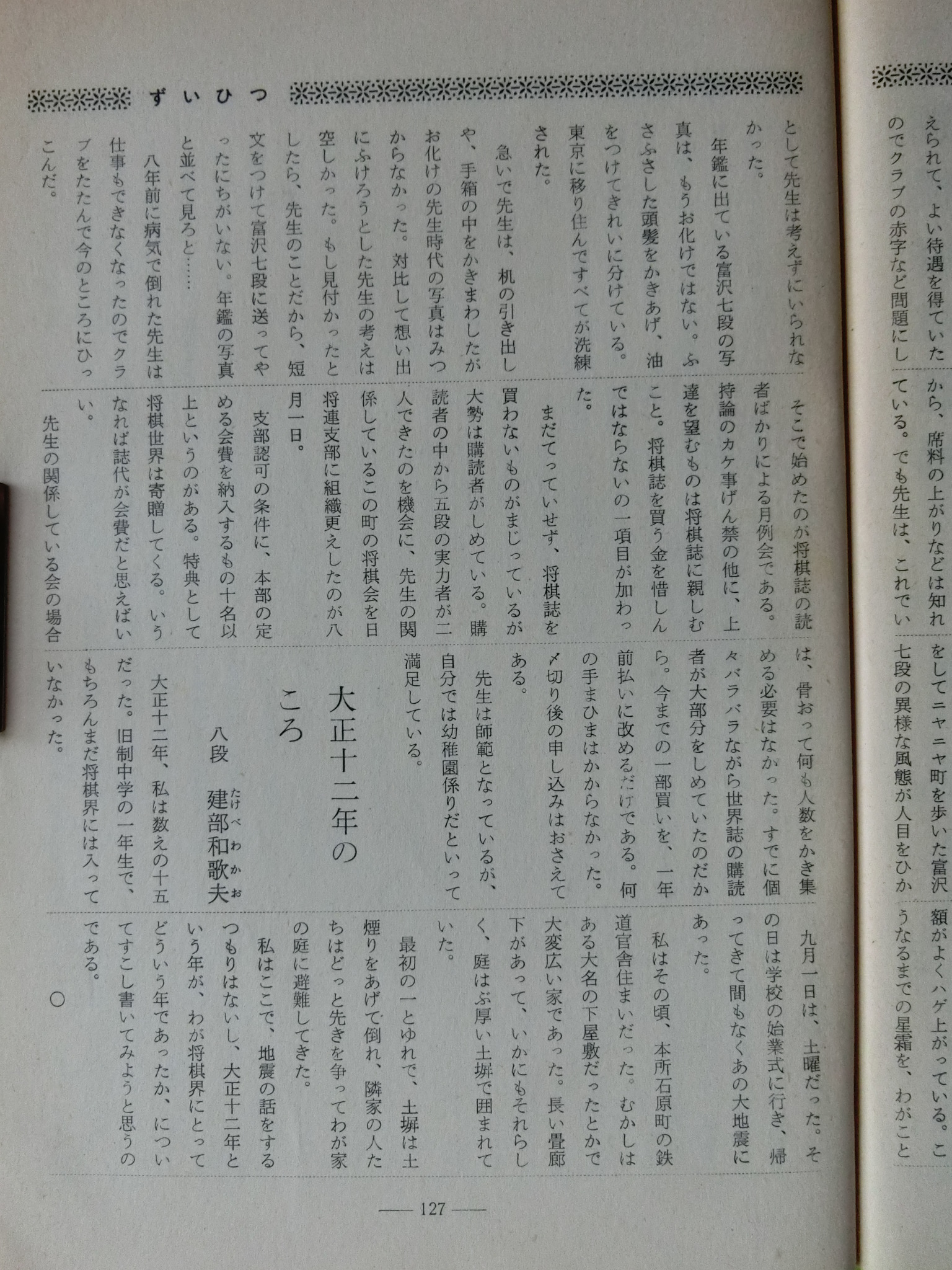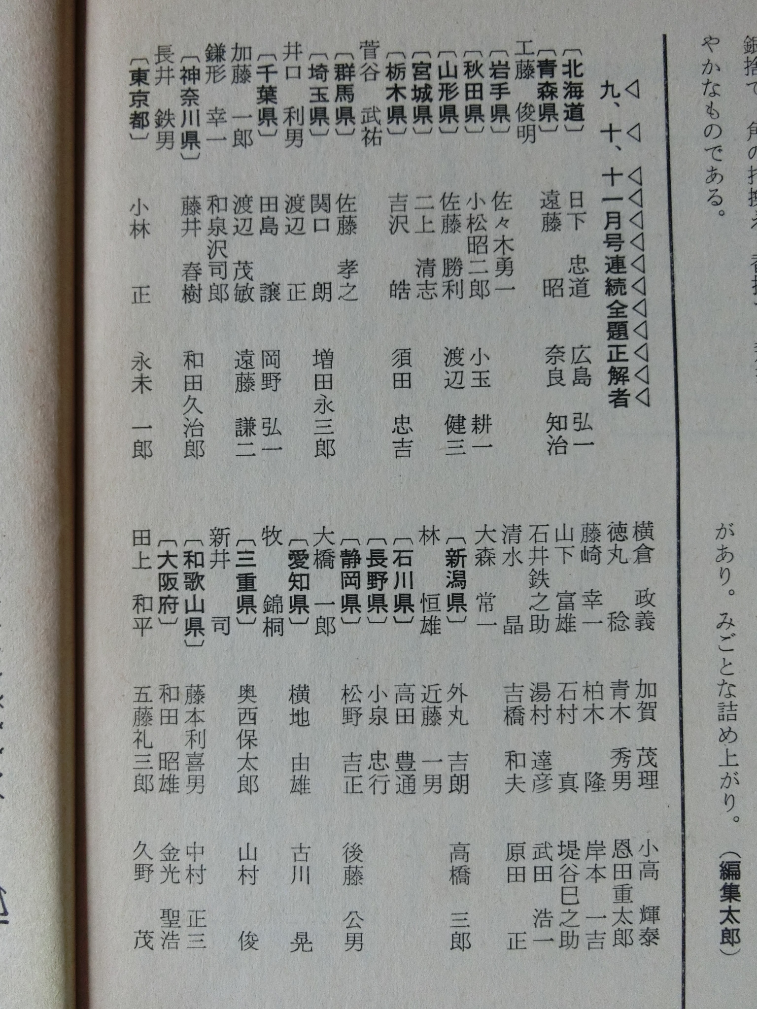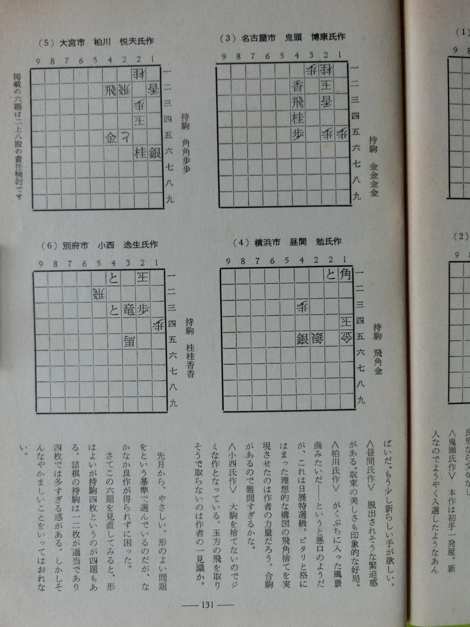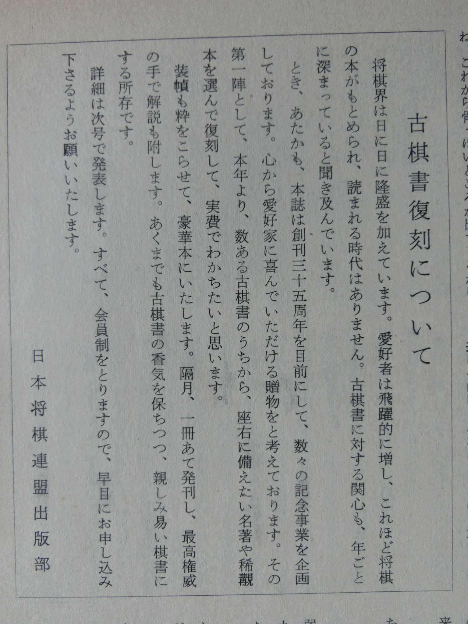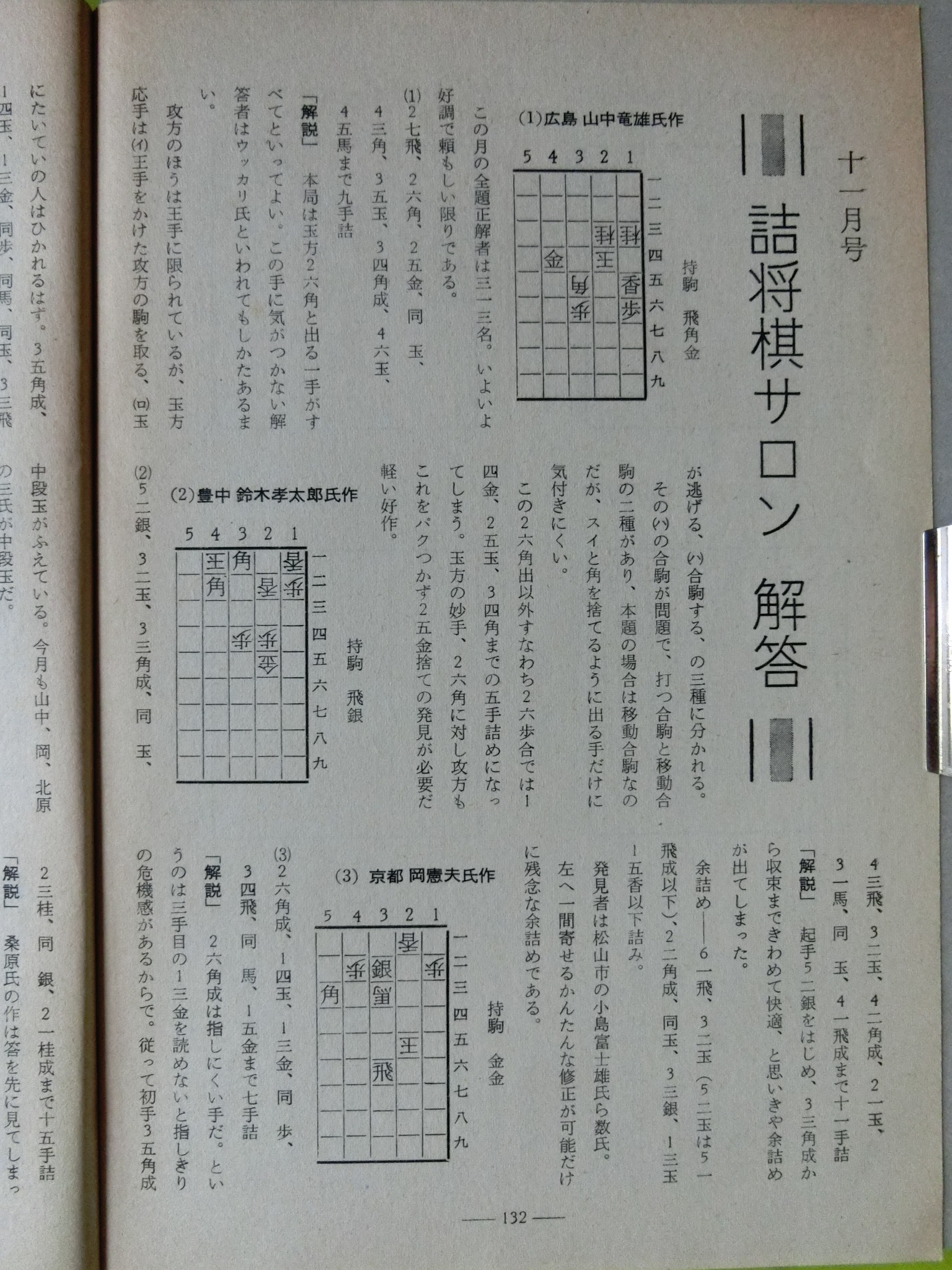 将棋世界 1969_昭和44年 1月 1日 1月号 大山康晴45才,鍋島古舟,高本功,吉田信義,梶塚昌弘,福井東呉之輔,石成富栄,近藤道義,田中義重,富沢幹雄,永沢勝雄,坂口允彦,西村一義,五十嵐豊一,内藤國雄,長谷部久雄,木村義徳,米長邦雄,加藤一二三,富沢幹雄,太期喬也 発行日 1969_昭和44年 1月 1日 発行 日本将棋連盟 大きさ A5 特別付録 無し 表紙・ニワトリ 鍋島古舟 才 カット 高本功 14ページ 三菱カラーテレビ 高雄 電子忍法 三菱電機 裏表紙 東芝電子連動 テレビ 王座 東芝 将棋棋士一覧から 棋士一覧DBから 名人 大山康晴 46才 1923年 3月13日 - 1992年 7月26日 グラビア 表彰感謝の日 橋爪新 7段 7氏昇段 グラビア 表彰感謝の日 将棋会館玄関 グラビア 第7期十段位決定戦 大山 2勝 加藤一二三 1勝 グラビア 将棋担当記者座談会 梶川(サンケイ)、勝村(日経) 岡(NHK)、落合(共同) グラビア 将棋担当記者座談会 田村(朝日)、頼尊(中日) 能智(新聞三社連合) 山村(読売) グラビア 今年のホープ 米長邦雄 6段 26才 1943年 6月10日 - 2012年12月18日 グラビア 大駒落指導対局 長谷部久雄 7段 大内延介 6段 グラビア 将棋連盟事務 箱根に遊ぶ ホテル花月園 グラビア 吉田女流名人、村山準名人 VS 初段コース卒業者 お好み対局 グラビア 最強者戦決勝 優勝 山田道美 8段 36才 1933年12月11日 - 1970年 6月18日 15ページ 新年のごあいさつ 日本将棋連盟会長 坂口允彦 8段 61才 1908年12月10日 - 1990年 1月18日 第7期十段戦 第2局 16ページ どたん場で逆転 自戦記 大山康晴 十段 46才 1923年 3月13日 - 1992年 7月26日 25ページ 一頁講座 穴熊囲い 西村一義 5段 28才 1941年12月14日 54ページ 一頁講座 迷い 西村一義 5段 28才 1941年12月14日 26ページ 将棋担当記者座談会 微動だにしない大山城 中原に期待 31ページ 古棋書復刻について 創刊35周年記念 詳細は次号で 基礎教室 36ページ 超初心講座 1 魔女と神童をつくる 五十嵐豊一 8段 45才 1924年 9月27日 - 2008年 8月30日 40ページ あたまの体操をどうぞ 11月号の解答 42ページ 香車の世界 1 1本気 内藤國雄 8段 30才 1939年11月15日 大駒落指導対局 46ページ 6枚落 力不足に泣く 吉田信義 8級 長谷部久雄 7段 36才 1933年 7月17日 - 2017年12月27日 48ページ 4枚落 下手、1手も誤まらず 梶塚昌弘 初段 大内延介 6段 28才 1941年10月 2日 - 2017年 6月23日 50ページ 2枚落 接戦中の下手の名手 福井東呉之輔 初段 長谷部久雄 7段 36才 1933年 7月17日 - 2017年12月27日 52ページ 2枚落 勝機を逸した金打ち 石成富栄 2段 大内延介 6段 28才 1941年10月 2日 - 2017年 6月23日 56ページ 一年で全読者に初段を 授与 69回 3問 木村義徳 6段 34才 1935年 5月 2日 60ページ 一年で全読者に初段を 授与 67回 解答 宮坂幸雄 7段 40才 1929年11月30日 66ページ 初段コース入段者 氏名 66ページ 初段コース入段者 氏名 58ページ 昇段コース試験問題 49回 3問 芹沢博文 8段 33才 1936年10月23日 - 1987年12月 9日 63ページ 昇段コース試験問題 47回 解答 松田茂行 8段 48才 1921年 6月28日 - 1988年 8月 2日 松田茂役 68ページ A級の名門 勝負師の記録 塚田正夫 9段 天狗太郎(山本亨介)46才 1922年 8月14日 - 1977年 8月28日 74ページ 米長邦雄6段の巻 順位戦好局集 米長邦雄 6段 26才 1943年 6月10日 - 2012年12月18日 吉田女流名人、村山準名人 VS 初段コース卒業者 87ページ 女流名人の貫禄示す 吉田紀代子 3段 近藤道義 初段 高柳敏夫 8段 49才 1920年 2月20日 - 1986年 9月27日 92ページ どの手が正解か? どの手が正解か? 村山幸子 2段 田中義重 初段 94ページ 解答 どの手が正解か? 村山幸子 2段 田中義重 初段 96ページ 棋士住所録 103ページ 春の箱根へ 1泊ご招待 第23期順位戦星取表 104ページ A級 成績表 11名 105ページ B級1組 成績表 14名 106ページ B級2組 成績表 20名 107ページ C級1組 成績表 14名 108ページ C級2組 成績表 16名 43年度前期 110ページ 関東奨励会A組 成績表 11名 110ページ 関西奨励会A組 成績表 10名 111ページ 関東奨励会B組 成績表 25名 111ページ 関西奨励会B組 成績表 16名 112ページ 花村、前回の優勝者を破る NHK杯争奪戦・第4局 六文銭謙 第18回 116ページ 学生将棋 関東大学秋季リーグ 早稲田、日大を破る 116ページ 学生将棋 関西大学秋季リーグ A級、京大が連続優勝 119ページ 新春クロスワード クイズ 120ページ 飛車落定跡をたずねて 古典定跡研究 富沢幹雄 7段 49才 1920年 4月20日 - 1998年 1月10日 126ページ ずいひつ お化けの先生 永沢勝雄 6段 65才 1904年 4月13日 - 1985年 2月22日 127ページ ずいひつ 大正12年のころ 建部和歌夫 8段 60才 1909年 7月25日 - 1974年 9月 4日 128ページ ずいひつ 大正12年のころ 建部和歌夫 8段 60才 1909年 7月25日 - 1974年 9月 4日 129ページ ずいひつ 因果な手 太期喬也 才 130ページ 詰将棋サロン 2題 選 升田幸三 9段 50才 1918年 3月21日 - 1991年 4月 5日 131ページ 詰将棋サロン 4題 選 升田幸三 9段 50才 1918年 3月21日 - 1991年 4月 5日 132ページ 詰将棋サロン 11月号の解答 編集太郎 133ページ 詰将棋サロン 11月号の解答 編集太郎 134ページ 詰将棋サロン 11月号の解答 編集太郎 134ページ 9,10、11月号連続全題正解者 全題正解者 編集太郎 134ページ 9,10、11月号連続全題正解者 全題正解者 編集太郎 将