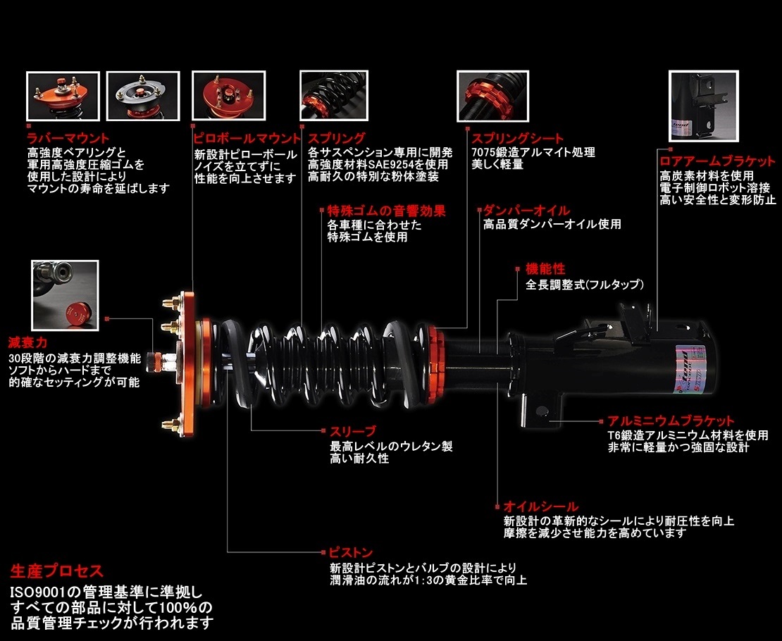 | ・ISO認証:ISO 9001 ・メーカー1年保証 ※保証内容はメーカー判断となります ・30段階減衰力調整式 ・全長調整式(フルタップ) ・モノチューブダンパー(単筒式) ・付属品:車高調レンチ/減衰力調整専用工具 ※キャンセラーは付属しておりません ※強度証明書などの書類は付属しておりません | |||