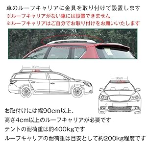 お取り付けには幅90cm以上、高さ4cm以上のルーフキャリアが必要です。