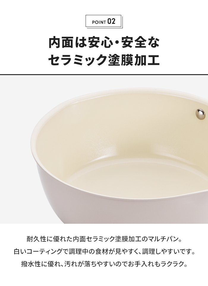 | ・これ一台で5役がこなせるので毎日のお料理に大活躍。 ・内面は安心・安全なセラミック塗膜加工。 ・セラミック加工は撥水性に優れ、汚れが落ちやすく摩耗しにくい。 ・内面が白色なので、調理中の食材が見やすく調理しやすい。 |