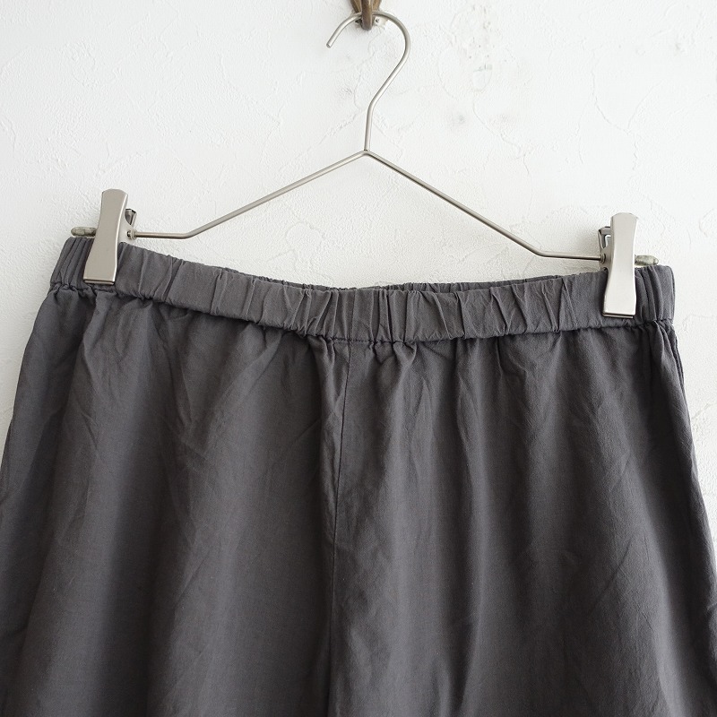 | evam evaのコットンイージーテーパードパンツです。カラーはダークグレーで薄手コットン地で仕立てられております。ウエストは総ゴムで、シンプルなアイテムです。 |