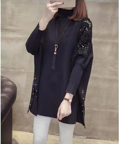 ニット セーター 長袖 秋冬 チュニック レディース トップス 大きいサイズ 袖コンシャス レース パフスリーブ ブラック 收藏