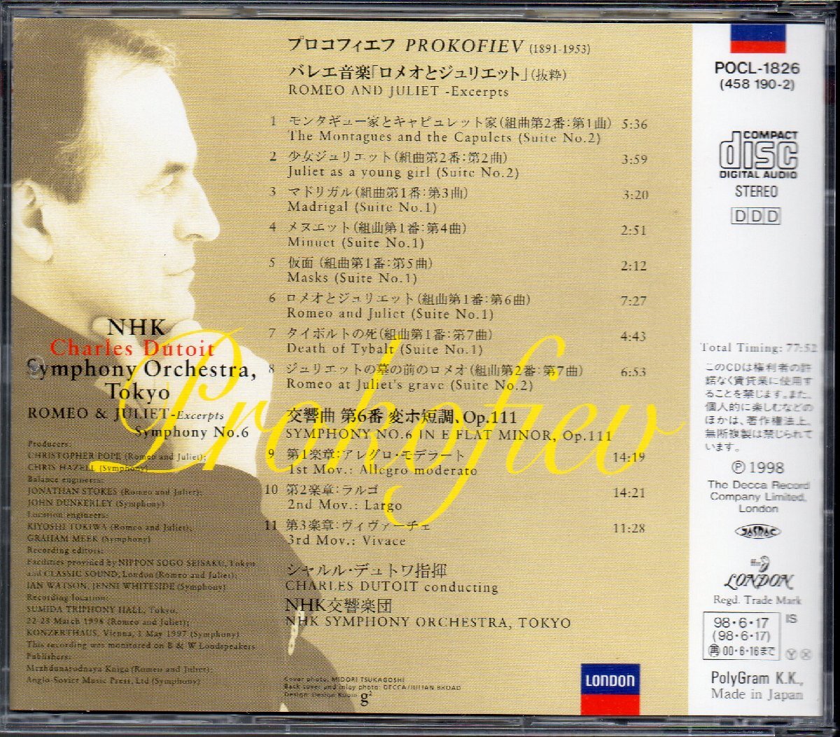 プロコフィエフ:交響曲第6番,ロメジュリ 抜粋 デュトワ=NHKso (POCL1826) 收藏