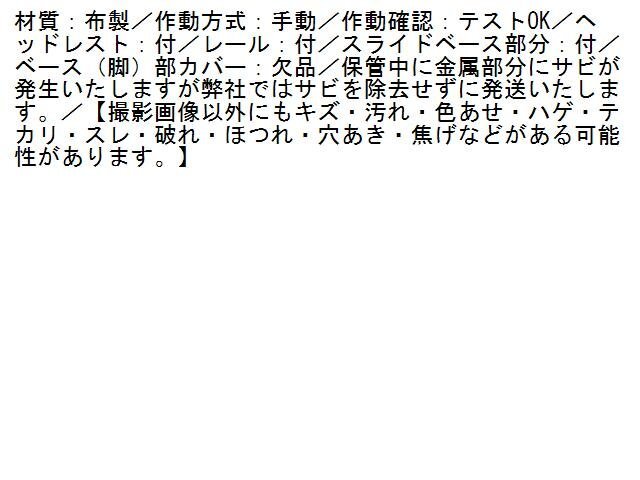 | 商品情報 | 材質:布製/作動方式:手動/作動確認:テストOK/ヘッドレスト:付/レール:付/スライドベース部分:付/ベース(脚)部カバー:欠品/保管中に金属部分にサビが発生いたしますが弊社ではサビを除去せずに発送いたします。/【撮影画像以外にもキズ・汚れ・色あせ・ハゲ・テカリ・スレ・破れ・ほつれ・穴あき・焦げなどがある可能性があります。】 | ||