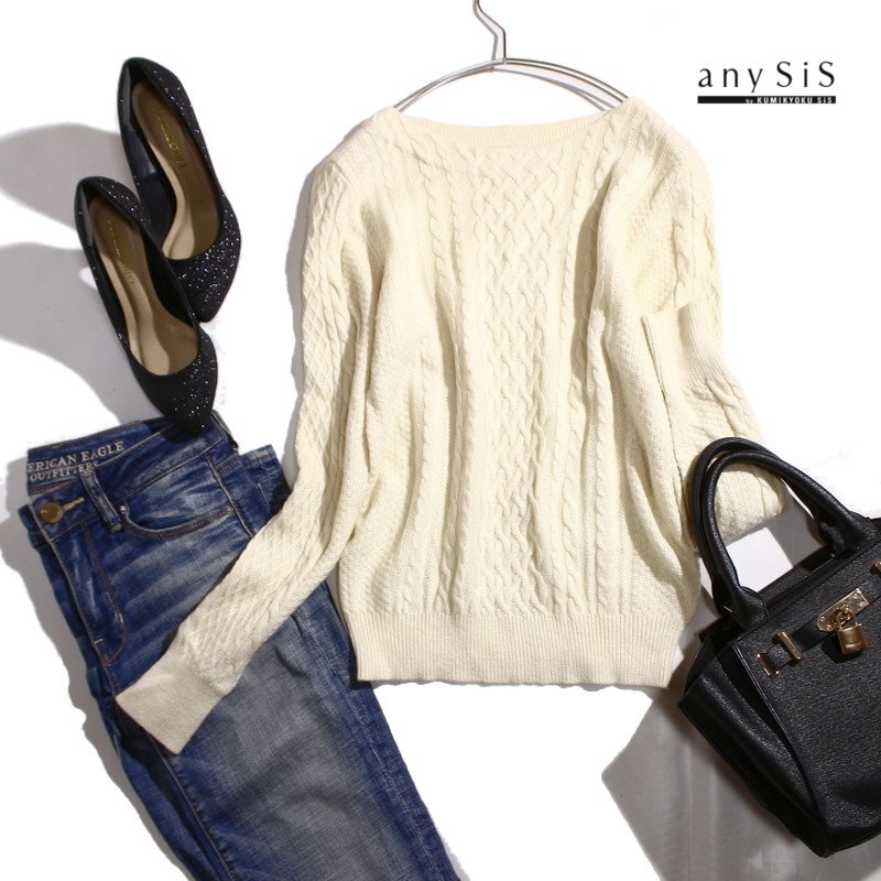 美品 any SiS エニィスィス 株) オンワード樫山 秋 冬 羊毛 カシミヤ ケーブル編み 長袖 セーター オフホワイト Mサイズ 2 カシミア 立体 收藏