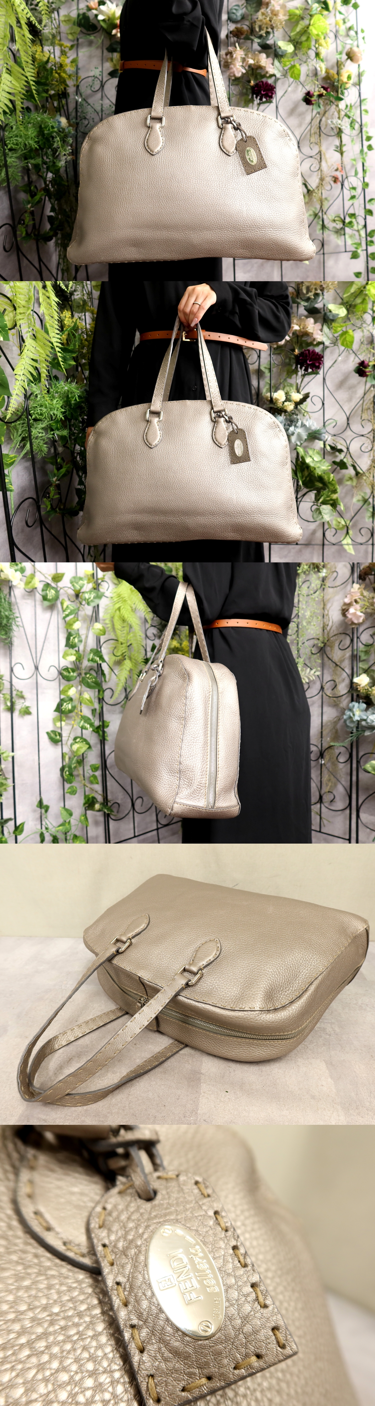 ●超美品●FENDI フェンディ●セレリア●カーフ レザー 本革●ハンド バッグ●メタリックグレージュ●シルバー金具●腕掛け●収納●Js61511 收藏