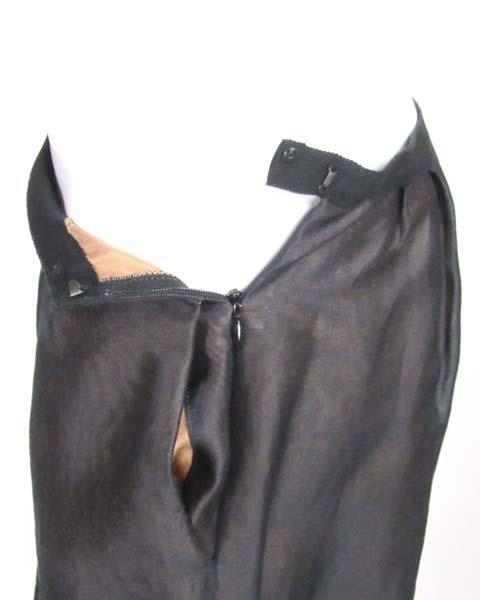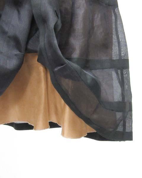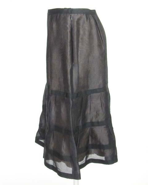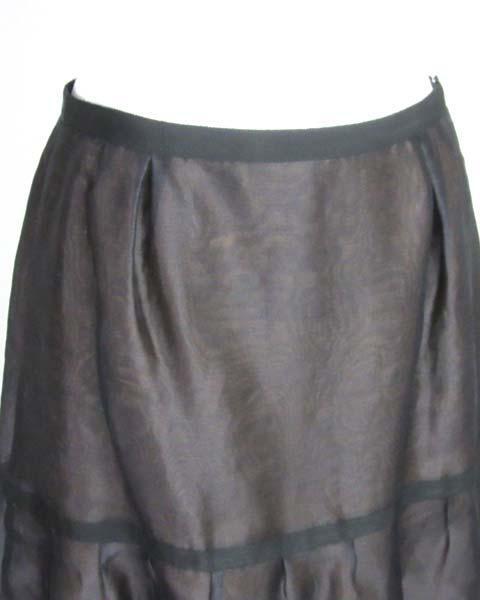 | 程よい光沢と透け感がエレガントなスカート薄ベージュのシルク裏地の上にこげ茶のリネンシルクの素材を重ねウエストやお裾にグログランテープがあしらってあります。あきのこない、長く着ていただけるデザインです。 |