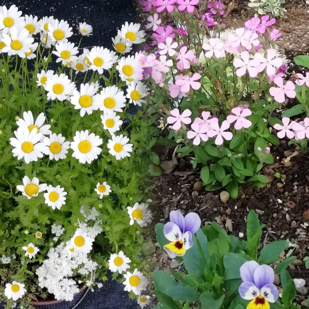 ビオラや白のノースポール、イエローのコツラと背丈が同じくらいでかわいくコラボできます。