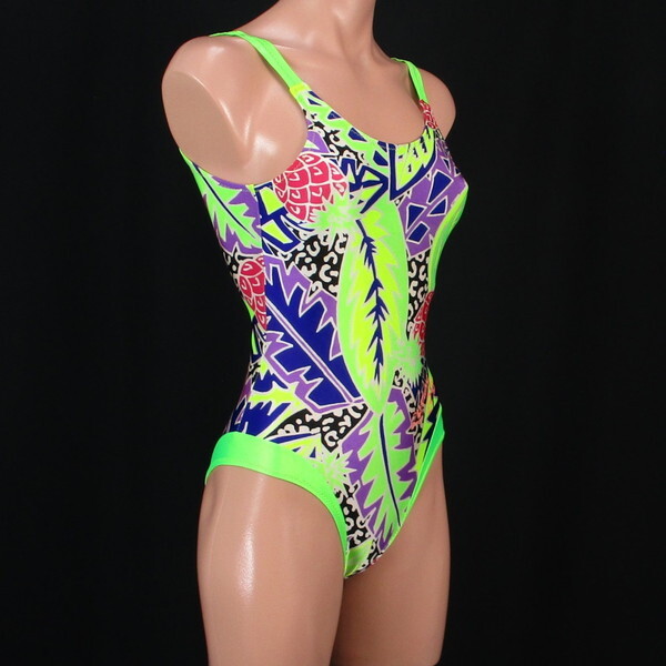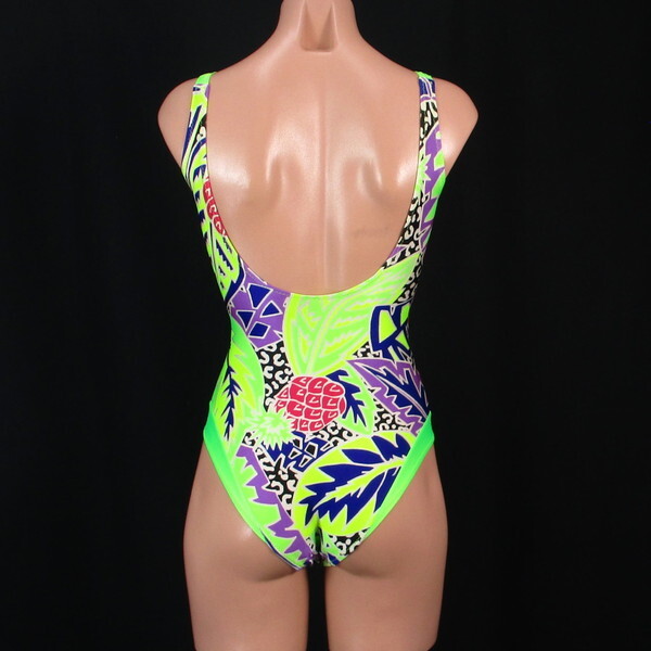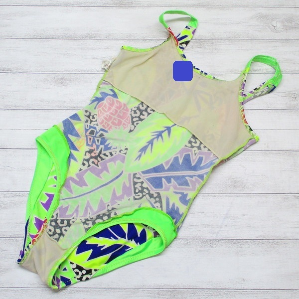 c5430★訳あり 使用感あり カラフル イラスト 蛍光黄緑 目立つ 140サイズ 女子 つるすべ 日本製 ワンピース水着 レディース 花柄 記名あり 收藏