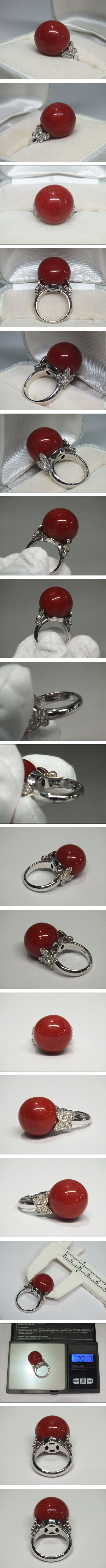 希少 超大粒 極濃血赤珊瑚 大粒丸玉 約18.5mm 天然血赤珊瑚指輪 リング pt900刻印 メレダイヤ 0.625ct サイズ12号 重量20.1g | |||