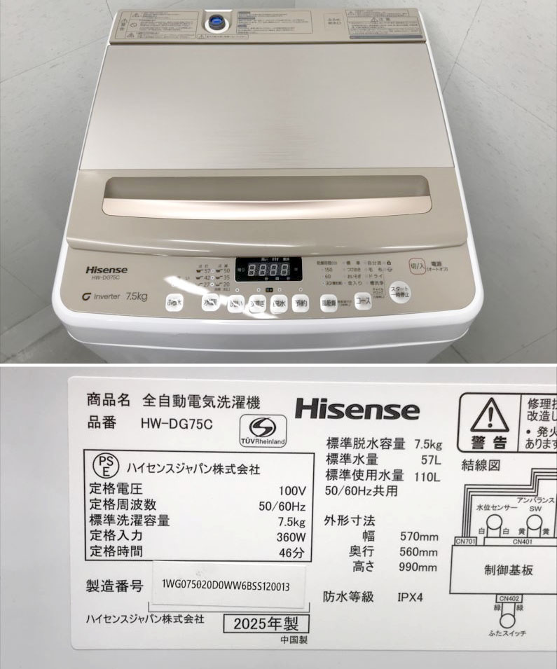 E1079YO ■1224 90日保証!【美品】縦型全自動洗濯機 洗濯7.5kg 上開き ハイセンス HW-DG75C 25年製 家電 洗濯機 收藏