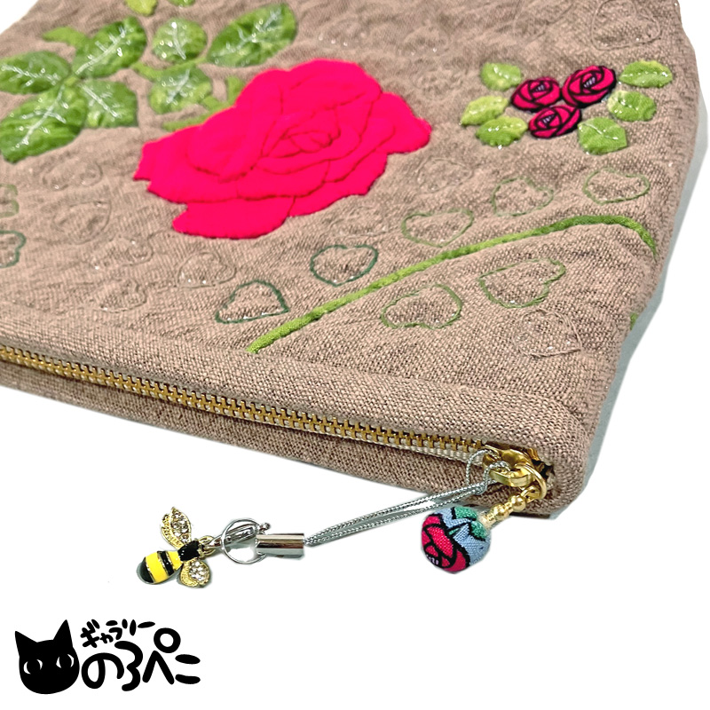 赤いバラが咲いたゆったり大きめキルトポーチ(薔薇のアップリケとハートキルティングのマチ付きポーチ・ブラウンベージュ) bc855-247 收藏