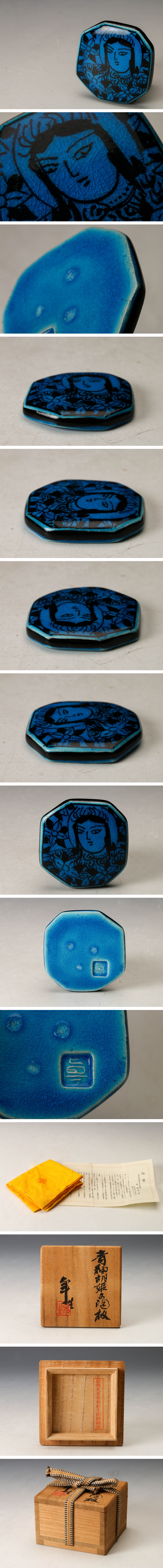 【佳香】人間国宝 加藤卓男 本人作 青釉胡姫文陶板 共箱 共布 栞 本物保証 收藏