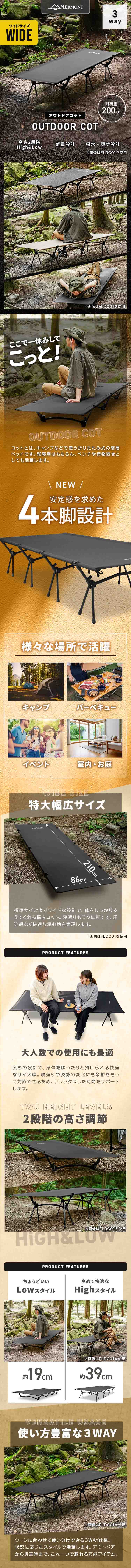 地面に触れず快眠!アウトドアで大活躍のフォールディングコット 地面の凹凸や湿気を気にせず、まるで自宅のベッドのような快適な寝心地を実現! \おすすめポイント/ ・寝返りや姿勢の変化にも対応できる幅広ワイド設計でゆったり快眠 ・2段階の高さ調整 ・ベッド・ベンチ・荷物置きとシーンに合わせて使い分けできる3WAY ・使わないときは折りたたんで収納袋にサッと収納!持ち運びにも便利な軽量設計 ・水にも強い撥水性 ・キャンプだけでなく、防災用の備えや来客時の簡易ベッドとしても活躍 品番:FLDC02SB 【商品仕様】 内容:コット本体、収納袋 カラー:サンドベージュ サイズ:ハイスタイル:(約)210×86×39cm ロースタイル:(約)210×86×19cm 収納時:(約)75×17×17cm 耐荷重:(約)200㎏ 重量:(約)3.5kg 素材:オックスフォード900D(シート)/アルミニウム(脚) ■他のカラーはコチラ■ 【注意事項】 ・折りたたみをするときに指を挟まないように注意して下さい。 ・コットの上で飛び跳ねたりしないでください。 ・膨らみが足りない時は直接息を吹き込んで空気を入れてください。 ・膨らませすぎるとエアマットが破損する可能性がございますのでご注意ください。 ・商品は、モニターによって色合いが異なって見える場合があります。 ・仕様・デザインは改良のため予告なく変更することがあります。 |