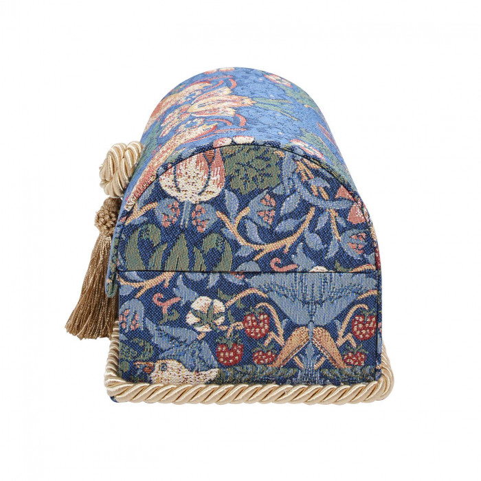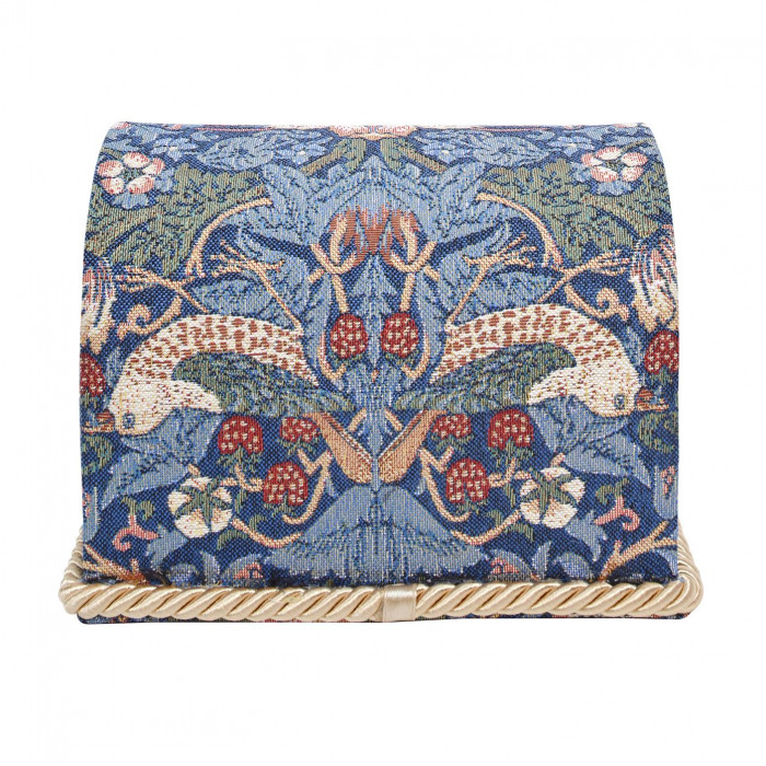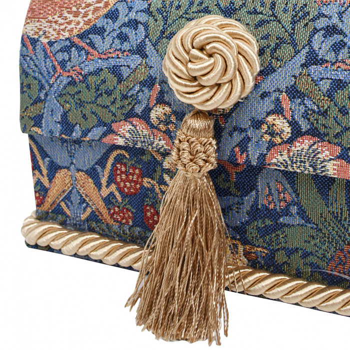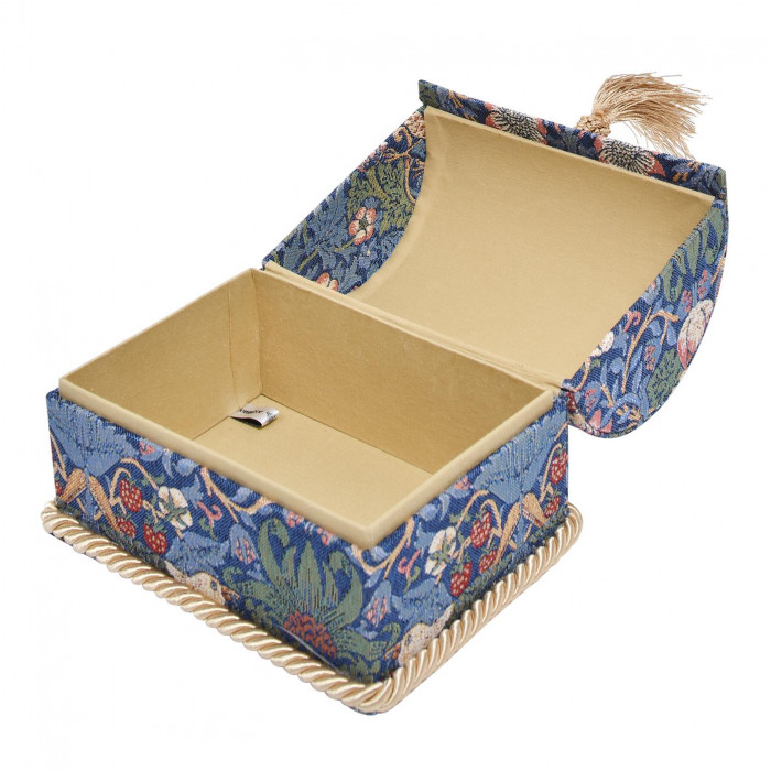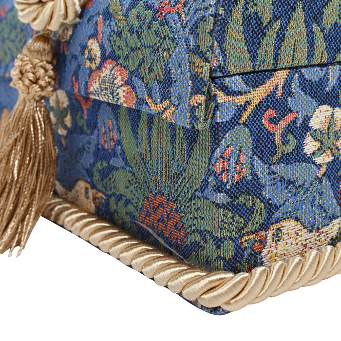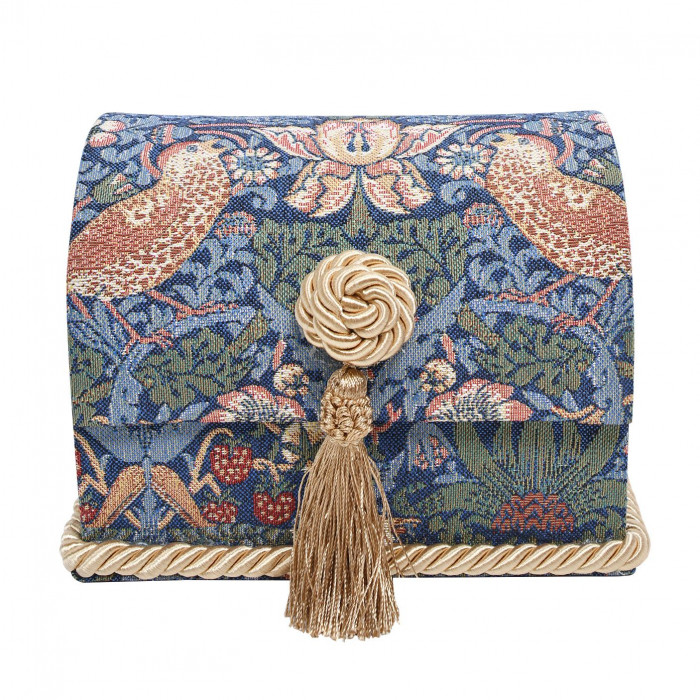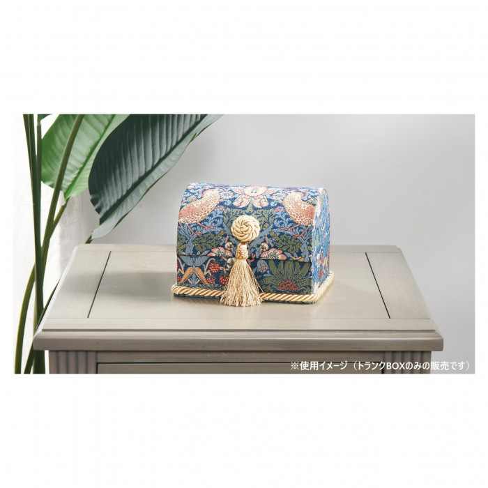 | ジェニファーテイラーとウィリアムモリスのデザインのコラボ。イチゴ泥棒の織生地が高級感を演出します。こちらはトランク型の小物入れです。チャームポイントのタッセルは取手にもなり、実用的です。マスク入れにもお勧めです。 |