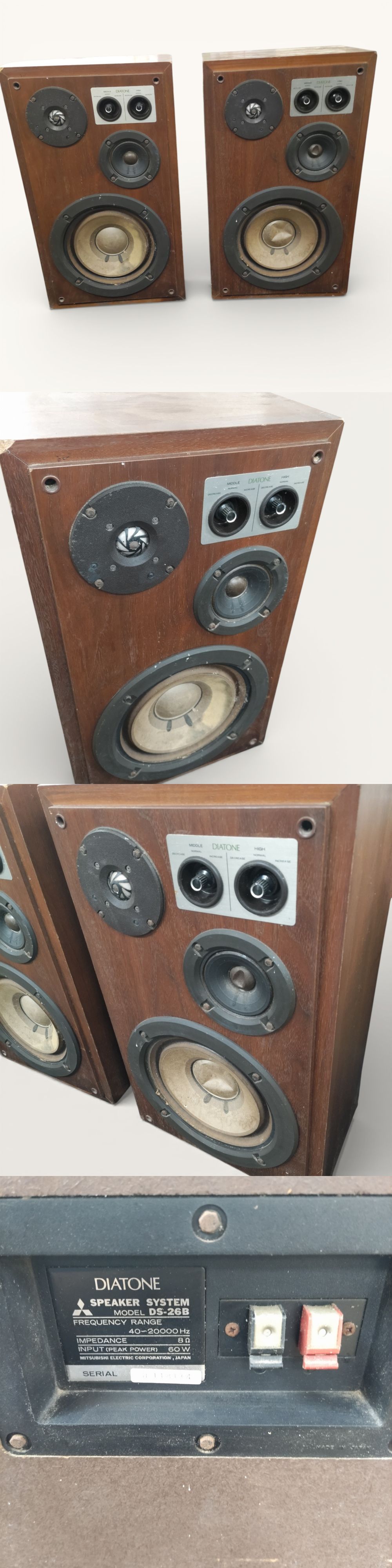 | ※必ず最後までお読みください。 Please be sure to read to the end. 一定要到最后※ | 商品概要 | 数あるオークションの中からこちらの商品をご覧頂きまして誠にありがとうございます! ※商品説明と注意事項を必ず全てお読み頂いた後にご入札下さい※ 引き続き 安心できる気持ちの良いお取引を心掛けてまいりますのでどうぞ 宜しくお願い致します! 色んなジャンルの商品を多数出品しておりますので、こちらをクリックしてご覧ください!! 東京都公安委員会 古物商許可 第307781505147号 ◎ダイヤトーン◎DIATONE DS-26B 3ウェイスピーカーシステム 中古現状 即発送 ※最下部にも写真掲載中なので必ずご覧下さい。 【商品概要】 キャビネットとユニットとのマッチングや音のつながりなどを重視して設計された3ウェイスピーカーシステム。 低域には25cmコーン型ウーファーを搭載しています。 中域には10cmコーン型スコーカーを搭載しています。 このユニットはアコースティックロード型となっており、振動板後部を完全に密封し、その空気室には吸音材が充填されているため、ウーファーとの干渉がありません。 また、磁気回路にはバリウムフェライトマグネットを採用しています。 高域には3cmドーム型トゥイーターを搭載しています。 このユニットの振動板には新設計のポリエステル樹脂製ダイアフラムが採用されており、異常振動を防ぐためにミクロングラスウールで制動がかけてあります。さらにエッジ部はサンドイッチ構造のダンピング処理を施し、エッジからの音の放射を防止しています。 エンクロージャーにはエッジレスキャビネットを採用しており、バッフル板の外周の飛び出たエッジ部分を排除したエッジレス構造となっています。また、ウーファーのサイズに対して十分に余裕のある容積のエンクロージャーを採用しており、容積と低音再生限界周波数の最適値を見つけ出す事で無駄なくウーファーを駆動させています。 さらに、従来あまり考慮されていなかった箱の振動に着目し、十分に計算して箱の補強位置を決定することで音質向上を図ってます。