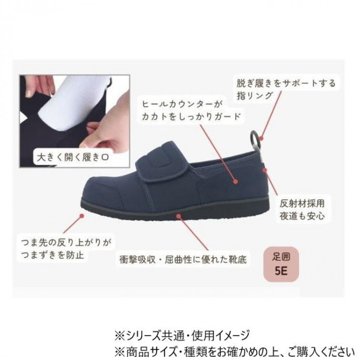 | ストレッチ性のあるゴムスポンジで、やさしい履き心地になっております。大きく開く履き口で脱ぎ履きが楽です。面ファスナーで容易に着脱できます。かかとには着用をサポートする指リングが付いております。 |