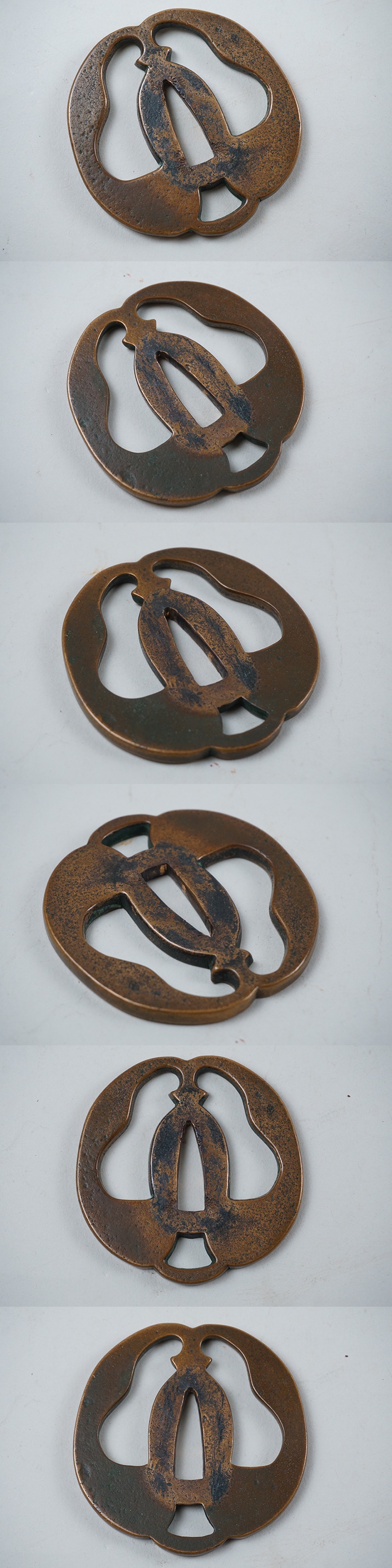 | 銅製透かし鍔です。小さな擦れなどありますが、大きな傷みありません。 画像ご参考の上ご入札ください。 幅72.2×70.9×4.9mm 茎穴28.4mm×9.1mm | ||
