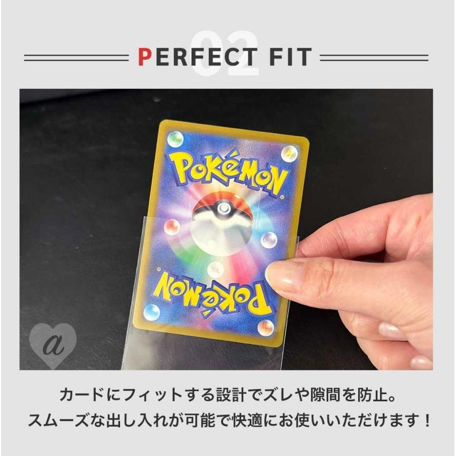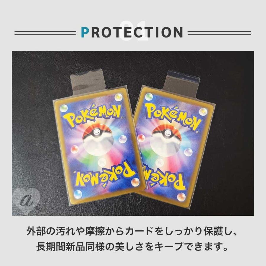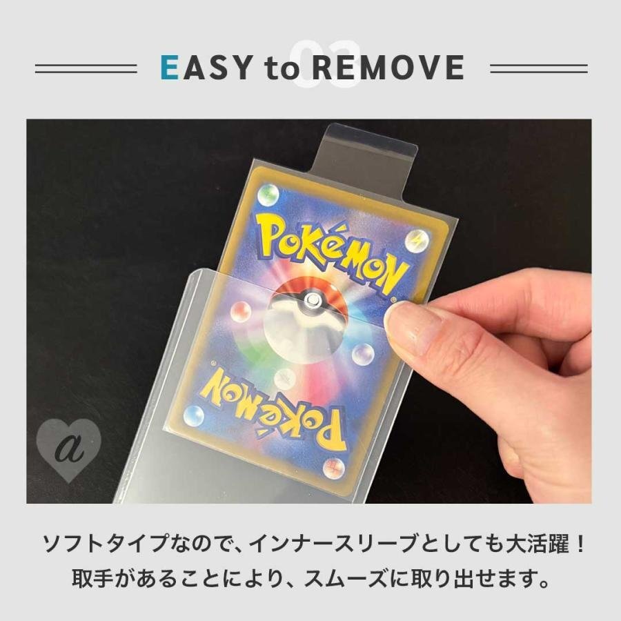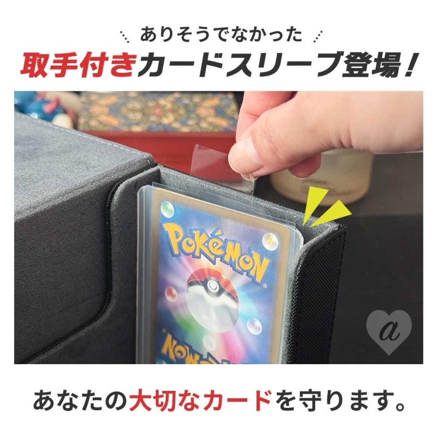 ピッタリフィットサイズのスリーブですと中のカードを取り出すときに取り辛さがあります。また、硬質アクリルケースや硬めのカードスリーブですと取り出す際に中のカードが傷んでしまう場合がありますがこちらの取っ手付きスリーブですと取っ手を引っ張るだけでスーッとカードに触れることなく簡単に取り出すことができます。大切なカードをストレスなく取り出すことができるので多くのコレクターの方に重宝されています。