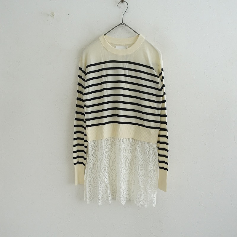 | Heriterのリバーレースパネルボーダープルオーバーです。 カラーはアイボリー×ブラックのボーダー&ホワイトのレースです。コットンの柔らかな薄手の素材で、レースの裾サイドはスリット入りです。 定価は37,400円(税込)のお品物です。 |