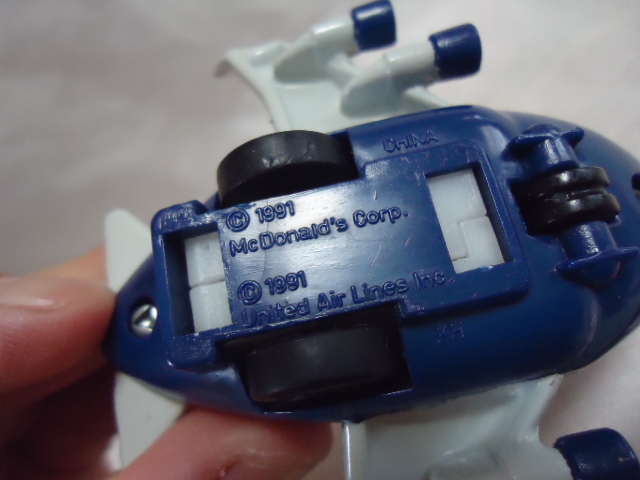 米国にて、USED物として、購入しました。グリマスを押すと、走ります。1991年製。米国マクドナルドで、出たハッピーミールの1点です。プラスチック製。USED物なので、少々キズ・汚れあります。サイズは、全長約7.2センチ・翼幅約7.5センチ・高さ約5センチです。USED物なので、ご理解のある方・24時間以内に、お手続き入力後、期限内にかんたん決済、出来る方のみ、ご入札をお願い致します。この商品は、1点物です。 2510