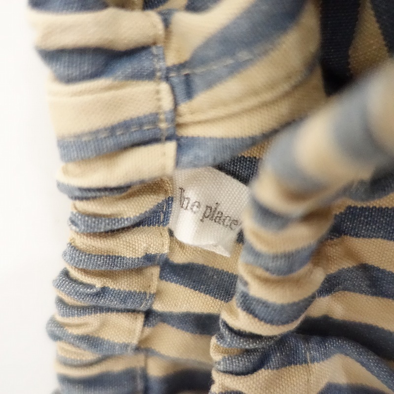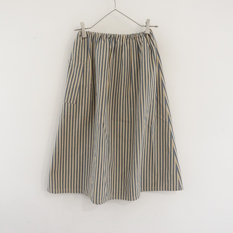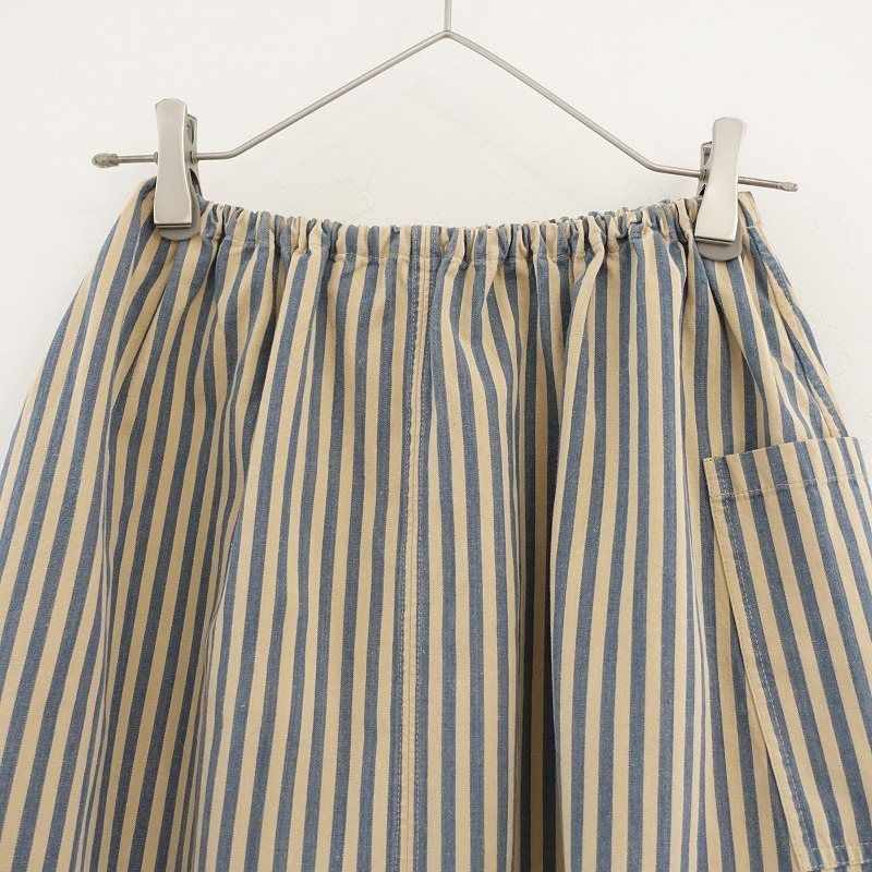 | Une place sur la Terreのストライプポケット付きギャザースカートです。カラーはベージュ、ブルーのストライプで、ウエストはゴム仕様です。サイドにパッチポケット付きのデザインです。 |