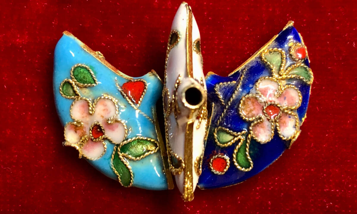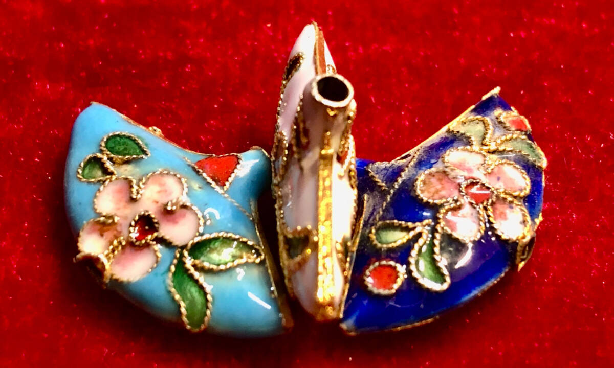 ¶!¶ 有線七宝焼ワールド - 3色(個)の扇子型ペンダントで1単位 ¶!¶ 金線に白水藍色釉ピンク花 手作り 手芸 工芸 インテリア ペンダント 收藏