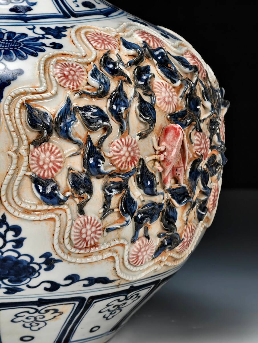 TM9#9691【3.1】中国骨董 人間国宝 磁器【青花釉裏紅四面開窓高浮彫り刻磁器摘花天球瓶】工芸品 施釉陶 青花磁 陶芸 精美彫 置物 收藏品 收藏