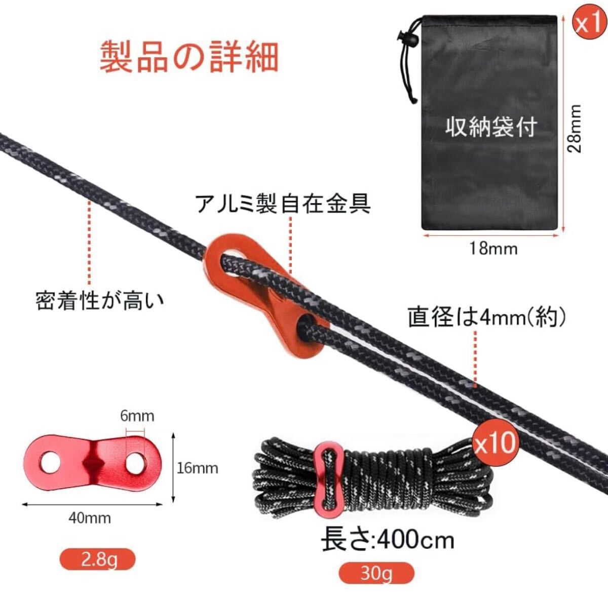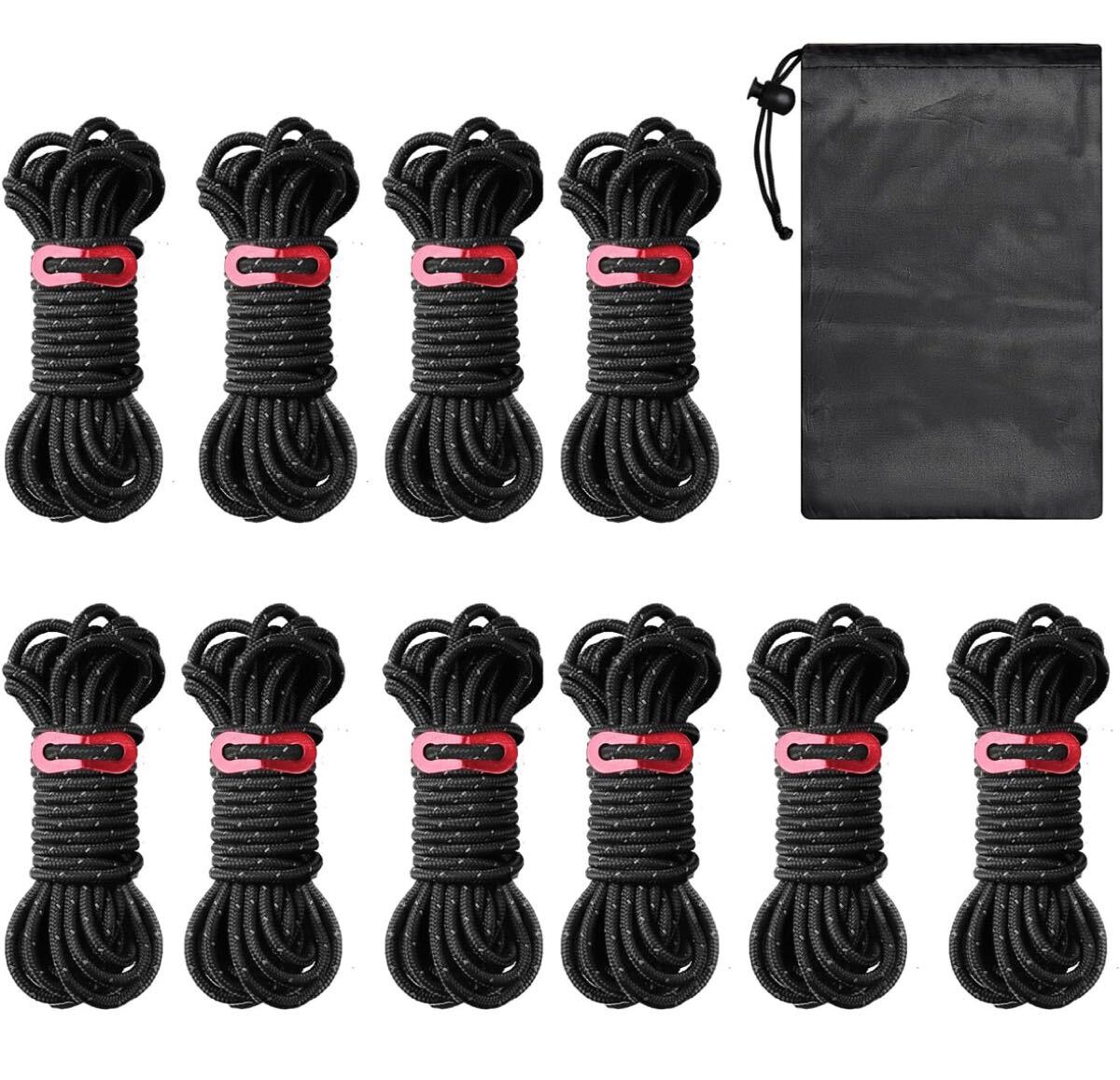 ガイロープ テントロープ キャンプ ロープ タープロープ パラコード 10本/セット 長さ4M 調節可能 耐荷重350kg キャンプ用品 テント設営 收藏