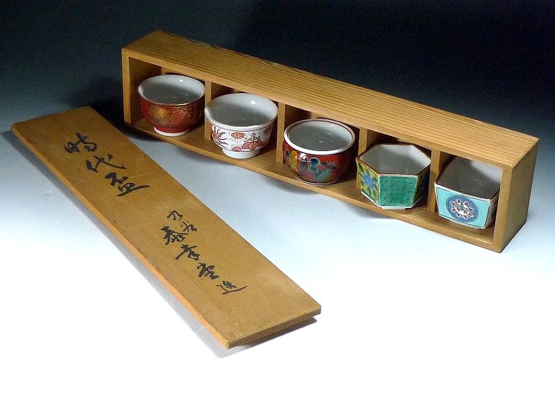 60YT97★九谷焼 九谷泰幸堂造 時代盃 ぐい呑み 5客入り 酒器 お猪口 食器 豆小鉢 共箱 染付 色絵 鳳凰 金彩 伝統工芸 收藏