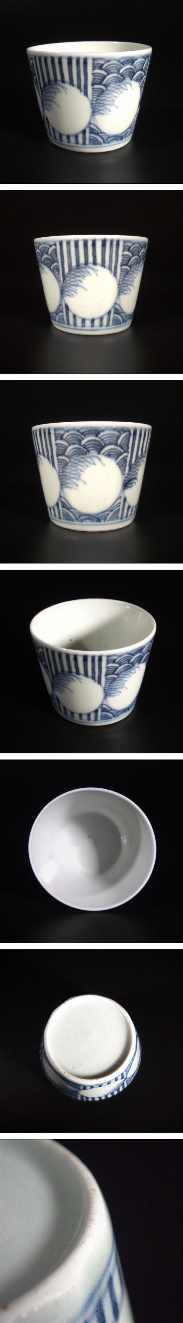 ■ 商品説明 丸紋のまわりに青海波と縦縞が交互に描かれた、おしゃれな染付猪口です。 丸紋は、まるで月に雲がかかっているようにも見え、静かな趣があります。 染付の発色も美しく、古伊万里らしいやわらかな筆の運びが感じられます。 口縁から胴にかけての形も端正で、手にしっくりと馴染む一品です。 |