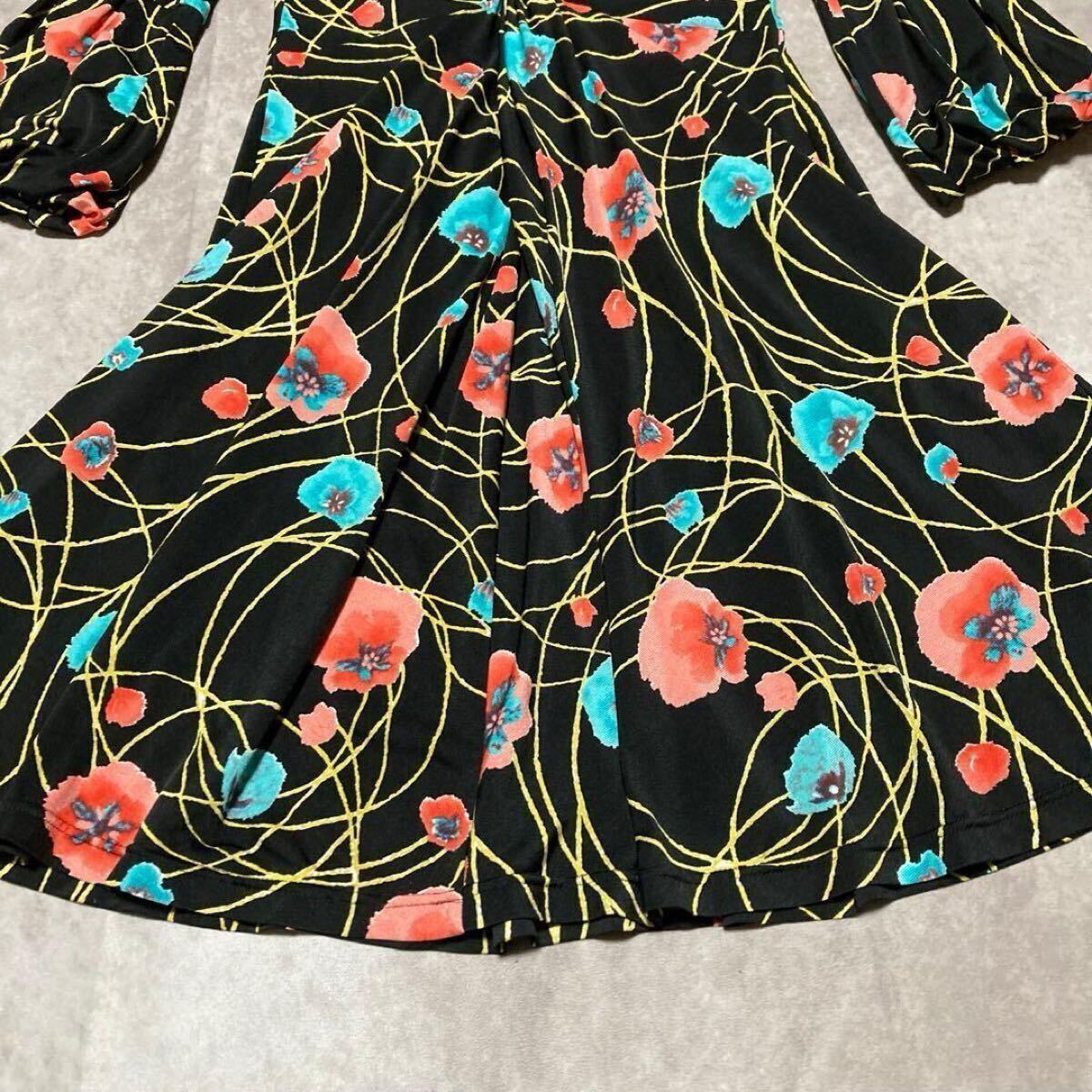 レジィーナロマンティコ Regina Romantico (36) ワンピース 膝丈 Aライン フレア 8分袖 花柄 総柄 薄手 Vネック 日本製 黒 ブラック 收藏