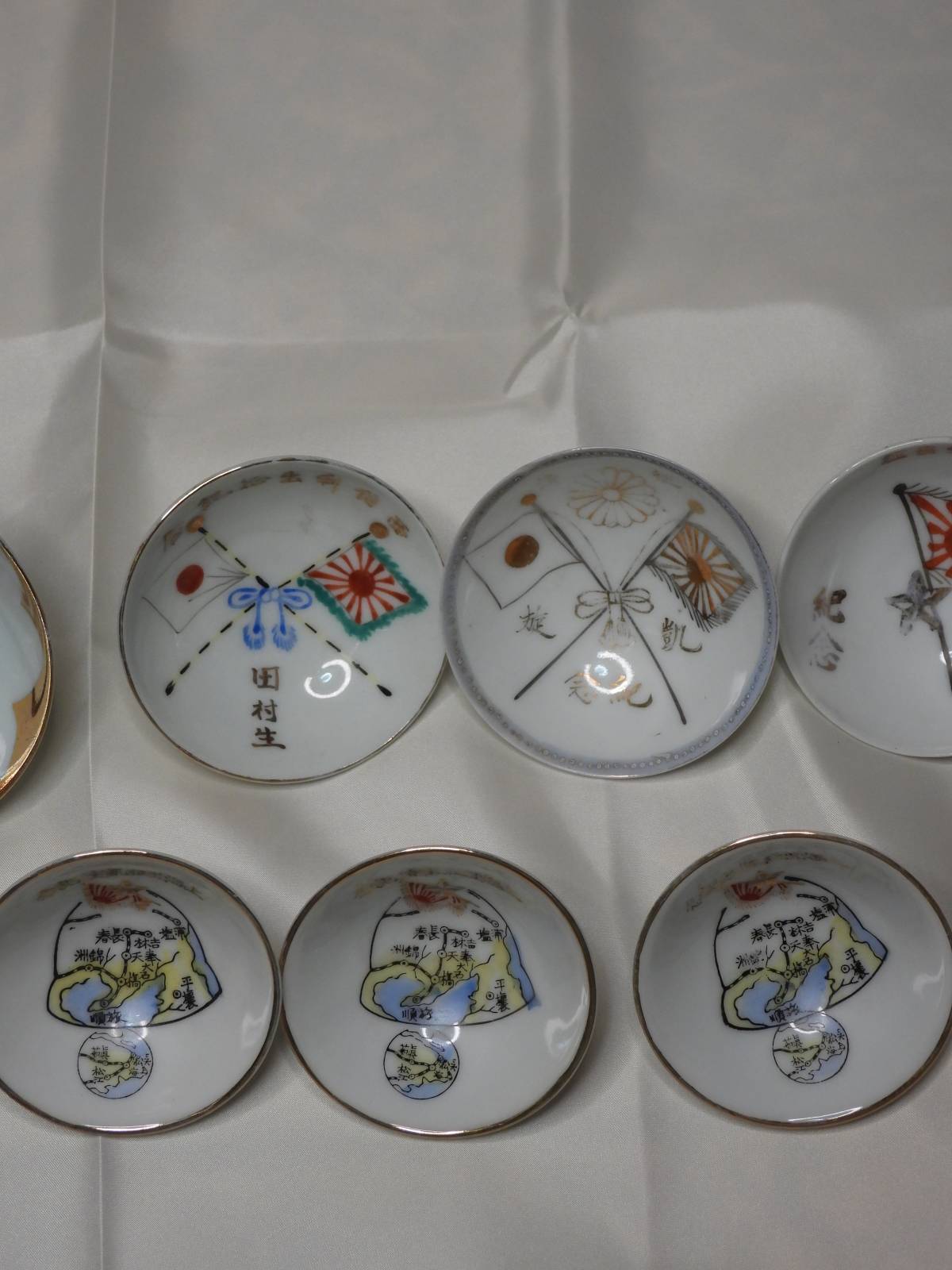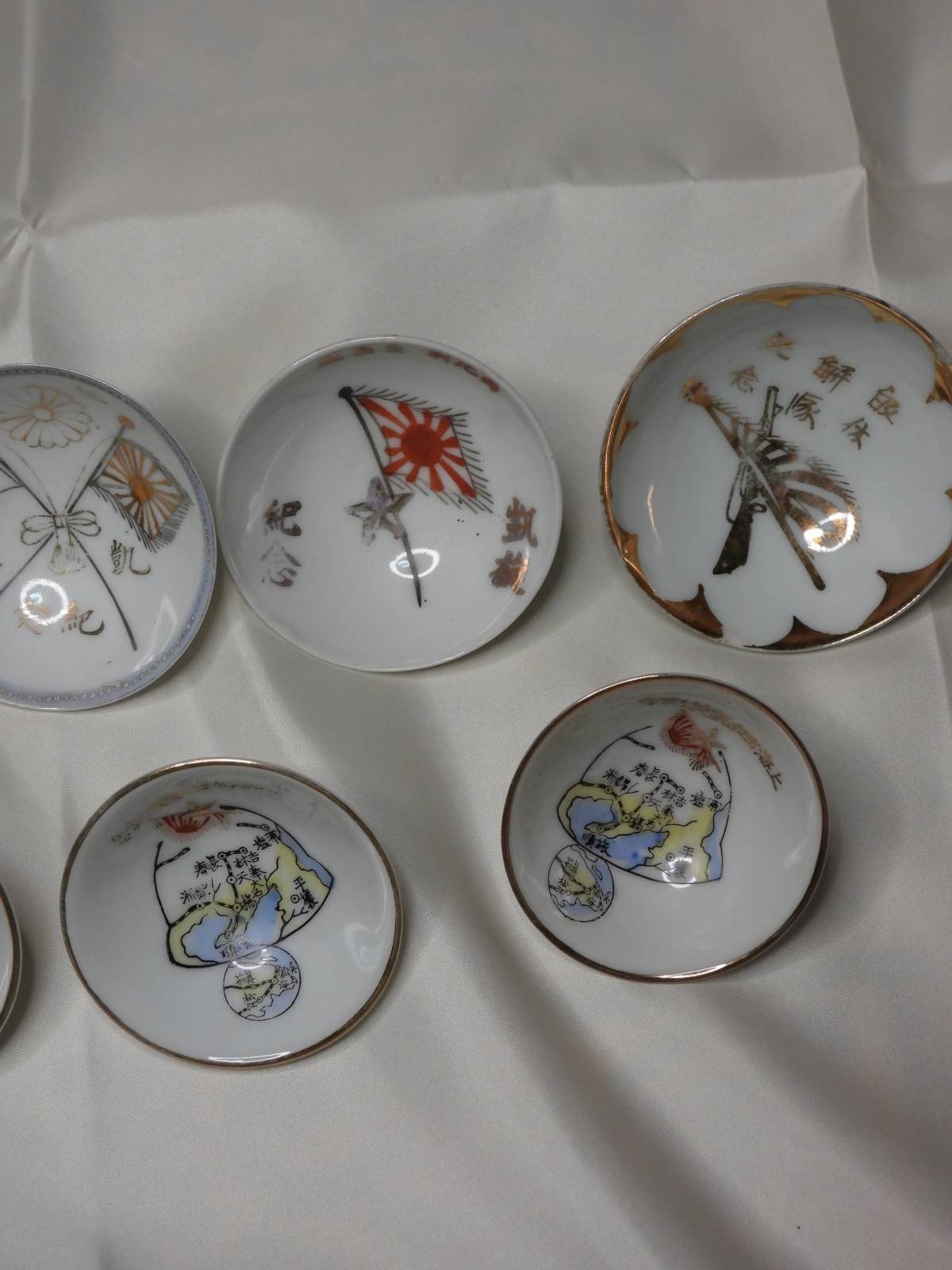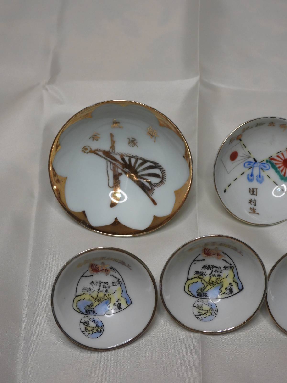 軍隊サカズキです。上海事変記念杯で、鉄帽型の満州と上海地図が描かれています。5点あります。シベリア出兵2点、渡満歩兵38連隊(奈良)等10点一括です。本文下の追加写真もご覧ください。ヤマト運輸宅急便で、全国一律700円でお送り致します。