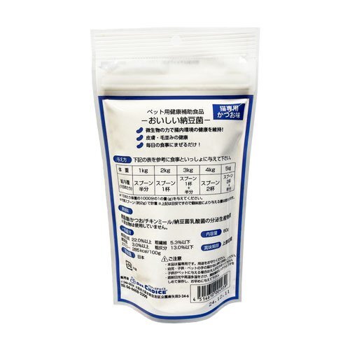 | 商品名 : ドクターズチョイス おいしい納豆菌 猫専用 かつお味 ペット用健康補助食品 【お得な送料無料商品】(商品代引き不可 送料無料商品以外との同梱時送料無料対応不可) 毎日の食事に混ぜて与えるだけのお手軽さ!!手間をかけずに簡単に与えれるのがうれしいですね… 体臭やおしっこ・ウンチのにおいも本当に少なくなるからビックリ!!  【おいしい納豆菌】は本気でペットの健康を考えている方に自信を持っておすすめします! 皮膚・毛並みの健康・強力消臭!健康・元気の源!おいしい納豆菌 ▼微生物の力で健康を維持! 私たちは昔から醗酵食品を食べ、健康維持に役立ててきました。納豆菌もその一つです。 ▼フン・オシッコの臭いを強力消臭! 微生物の力でフン・オシッコのニオイを強力消臭します。 ▼毎日の食事にまぜるだけ! 毎日の食事に体重の1000分の1の量を加えるだけで大丈夫です。スプーン付き!(約5g/1杯)       【おいしい納豆菌】は試行錯誤を繰り返し長時間かけて完成したDRS.CHOICE ドクターズチョイスの自信作です。 実際にお使いいただいた方の、実に82%が 「体臭が気にならなくなった」 「尿のにおいが少なくなった」 などの効果を実感されています。 その他にも、 ・膿皮性指間炎が改善された。 ・かゆがらなくなった。 ・外耳の痛みがやわらいだ。 ・毛艶が良くなった。 等、多数の効果が報告されています。 ■■ おいしい納豆菌のパワーの秘密 ■■ 上記のお客様の声の様な効果をもたらすパワーの秘密はどこにあるのでしょうか??? その答えはRHエキスです。 RHエキスは発酵食品に常在する乳酸菌類・納豆菌類・酵母菌類等を米ぬかエキスで共棲醗酵させて生産した分泌物及びその他の栄養成分を濃縮した「乳酸菌納豆菌生産物質」です。 開発者であられる 武安 成一氏(鳥取大学農学部農芸化学科卒業後、独自の研究開発室を設け、今日まで数々の特許を取得)により見出され、現在までの実験・検証結果により免疫活性をはじめ抗酸化作用・整腸作用などの顕著な効能があると言われています。 ■■ RHエキスの特徴 ■■ 胃酸に強く、腸まで届く 高圧殺菌(120℃・15分)されており、強酸(胃酸)によっても効果は失われません。 合成着色料・保存料無添加 厳選された米糠、ブドウ糖と水を使用した天然素材の発酵食品です。ラット等による摂取実験をはじめ、畜産動物・ペットや人による長期間にわたる摂取や過剰な摂取においても副作用などが全く無い事が確認されています。 【おいしい納豆菌】は本気でペットの健康を考えている方に自信を持っておすすめします!!! ■■ 与え方の目安 ■■ ・毎日の食事に体重の1/1000の量を与えて下さい。 ・給餌の多少の増減では栄養のバランスを崩す心配はありません。 ・チャック付きなので、ちょっとだけ与えたい時や保存時に便利ですよ^^ ・体重1kg・・・・スプーン半分 ・体重2kg・・・・スプーン1杯 ・体重3kg・・・・スプーン1杯半 ・体重4kg・・・・スプーン2杯 ・体重5kg・・・・スプーン2杯半 ※計量に便利なスプーン付 ■■ 原材料 ■■ 脱脂糖、かつおorチキン、チキンミール、納豆菌乳酸菌の分泌生産物質 ※粉砕混合した後、100-120℃に加熱し、粉末状に加工してあります。 ※添加物は使用していません。 ■■ 主 成 分 ■■ 粗タンパク質 22%以上 粗 繊 維 5.3%以上 粗 脂 肪 3.0%以上 粗 灰 分 13%以下 285kcal/100g ・原産国 : 日本 ・内容量 : 80g |